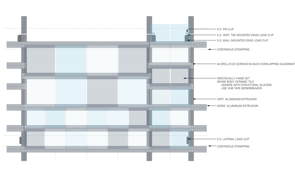 The western and eastern elevations of the original building are composed of concrete masonry units while those to the north and south consisted of glass and stucco over metal studs. 5G Studio reached out to engineering and facade consultation firm Studio NYL for help on the installation of the tiles.