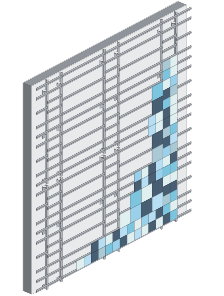 The rain screen system rests on a matrix of custom-fabricated aluminum rails, and the gridwork provides spacing between the existing wall and tile. The tiles come in two different sizes: nine by nine inches, and six by six inches. There is a quarter-inch joint between each tile.