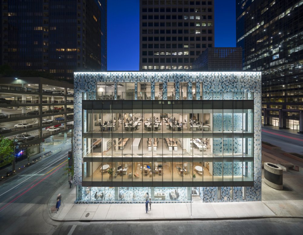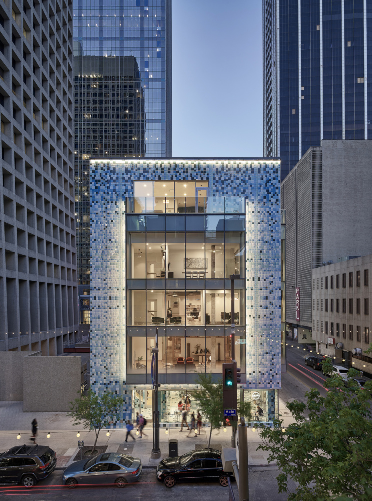 Downtowns across the United States are littered with mid-century concrete office buildings reaching the end of their lifespans; the question facing cities is how to repurpose these aging assets while enlivening their public-facing street walls. Located in the center of Dallas, 5G Studio Collaborative’s 1217 Main Street breathes new life into a former bank with a vivid ceramic facade cladding a five-story, office-and-retail space.