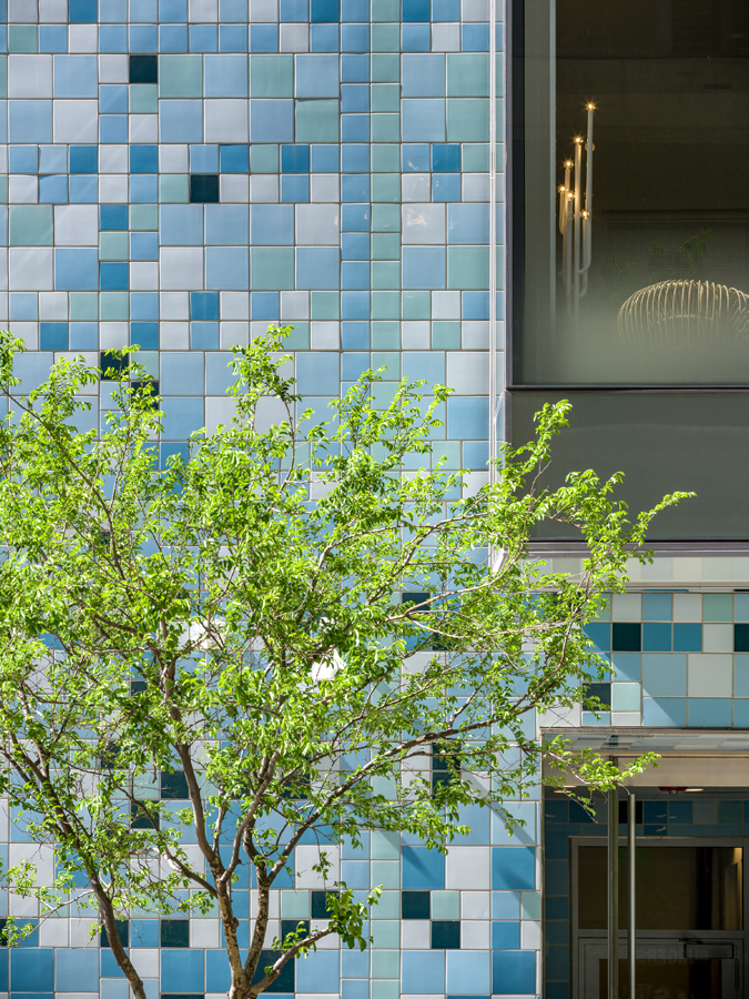 For the design and fabrication of the 36,215-tile facade, 5G collaborated with Mexico-based artist Jorge Pardo. Ceramica Suro, a ceramics manufacturer in Guadalajara produced the tiles.