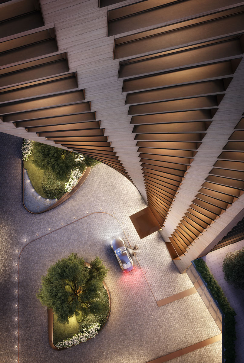 As the renderings of the project show, the unitized system is met with an aluminum metal composite panel enclosure with the same bronze finish as the curtain wall. Due to the complexity of the facade, all elements were custom engineered and fabricated.