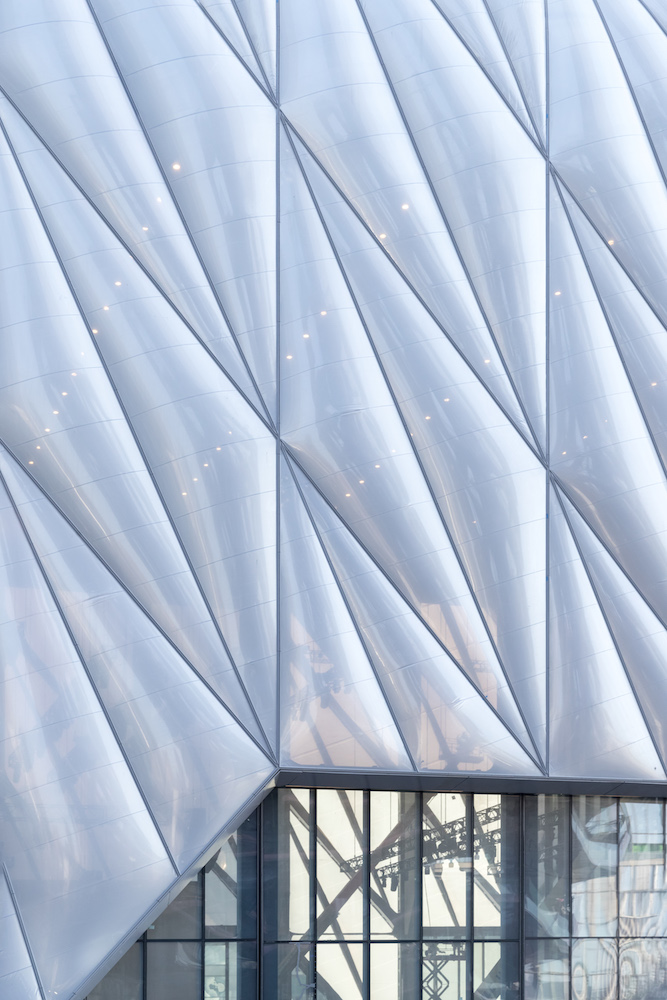 Collaboration proved crucial to the project. DS+R, facade consultant and structural engineer Thornton Tomasetti, contractor Sciame, and fabricators were involved from the early design-assist phase. According to Thornton Tomasetti associate Alloy Kemp, the early stages of the design sought to push the limits of the ETFE panel size while meeting the daylighting and acoustical requirements of the performance space within. The structural steel frame is girded with a U-shaped upstand that is fastened at key points; fabricator Cimolai assembled each component in Pordenone, Italy, prior to shipment to New York. Once in place, the steel shell was outfitted with aluminum extrusions and plates, and then the ETFE panels were installed. Inflation tubing was set for each panel during the installation process.