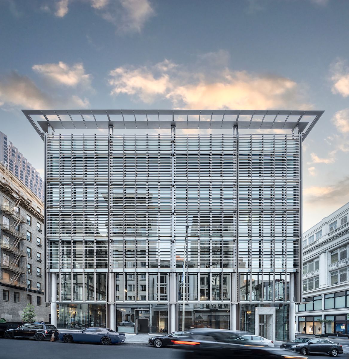 The sintered stone system, produced by Neolith, was custom cut from standard marble tiles to create a continuous natural vein pattern that can be seen on one side of the building. An increased ceiling height highlights the tall windows behind the slatted exterior metal system, allowing the interior to have flexible sunlight diffusion and privacy. MBH brought on renowned historic architects, Page & Turnbull, to help achieve this goal and incorporate a softer terra-cotta finish to the metal scrim system.