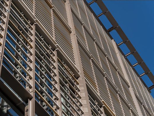 The facade exterior is comprised of over 2,800 aluminum tubes that are attached to the vertical scrim system within a simple ladder frame design. The scrim system developed by Centria has a hierarchy of three layers: The vertical plates attached to the stone columns, the horizontal aluminum tubes attached to the vertical plates to mimic the terra-cotta tubes, and the flat aluminum tubes running continuously at the bottom of the second level and up.