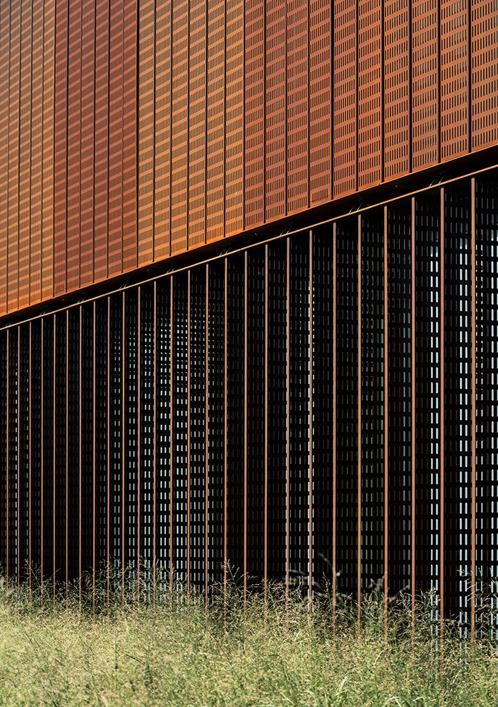 The three protruding wings of the New Science Center are all three stories in height and clad in a screen of weathered steel produced by Zahner. Along the complex’s forecourts, the perforated weathered steel panels face narrow side out, while the western elevations are fully shrouded. The weathered steel is backed by narrow glass-and-composite-metal panels.