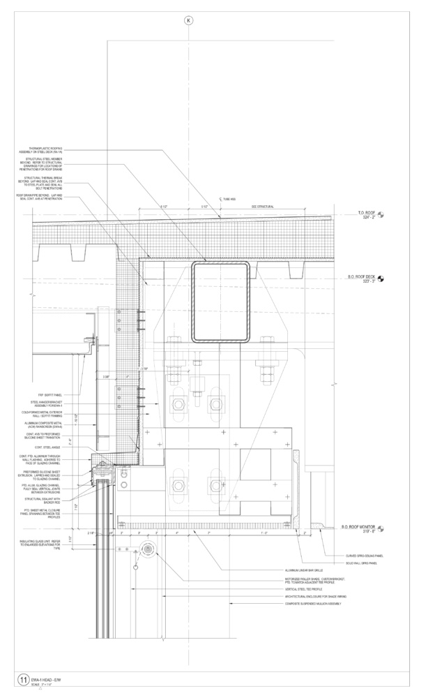 A series of sawtooth skylights is located atop the primary rectangular volume and serves two functions: further illumination of the interior and structural support for the glass curtainwall. The steel roof structure is cantilevered from the concrete core, and in turn, hangs the glass curtain wall. According to the design team, “the columns supporting the glass wall are nearly 40 feet removed from the curtain wall, supporting a load of nearly 10,000 pounds per mullion in addition to the dead, snow, wind and seismic loads.”