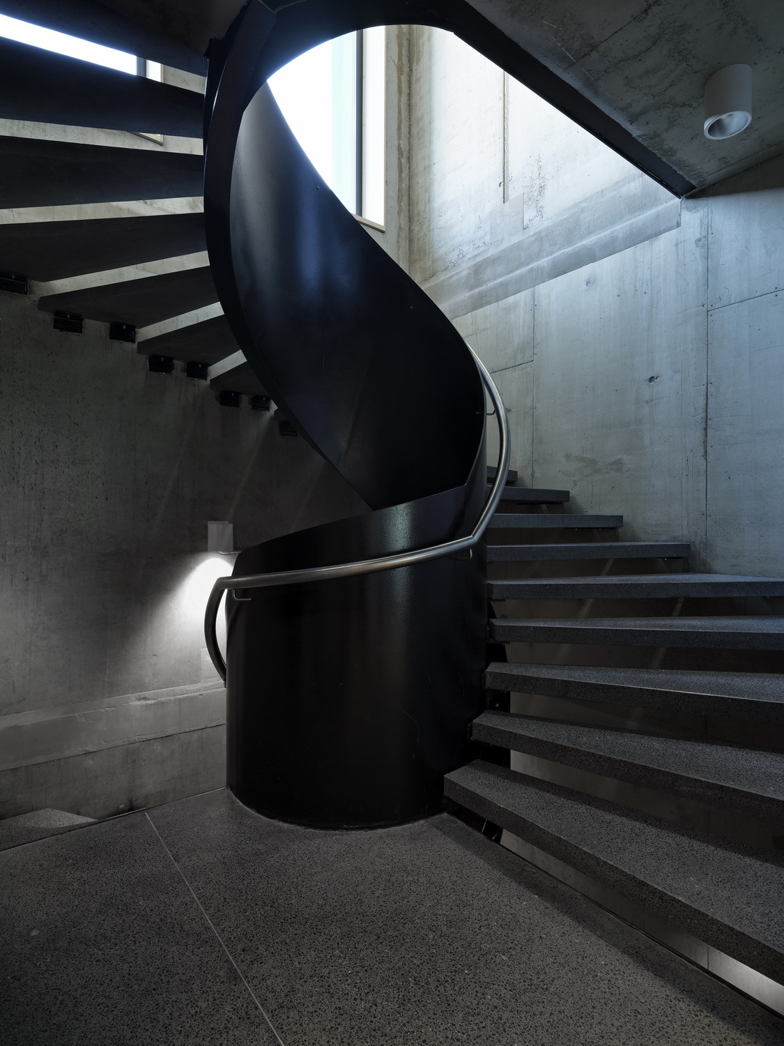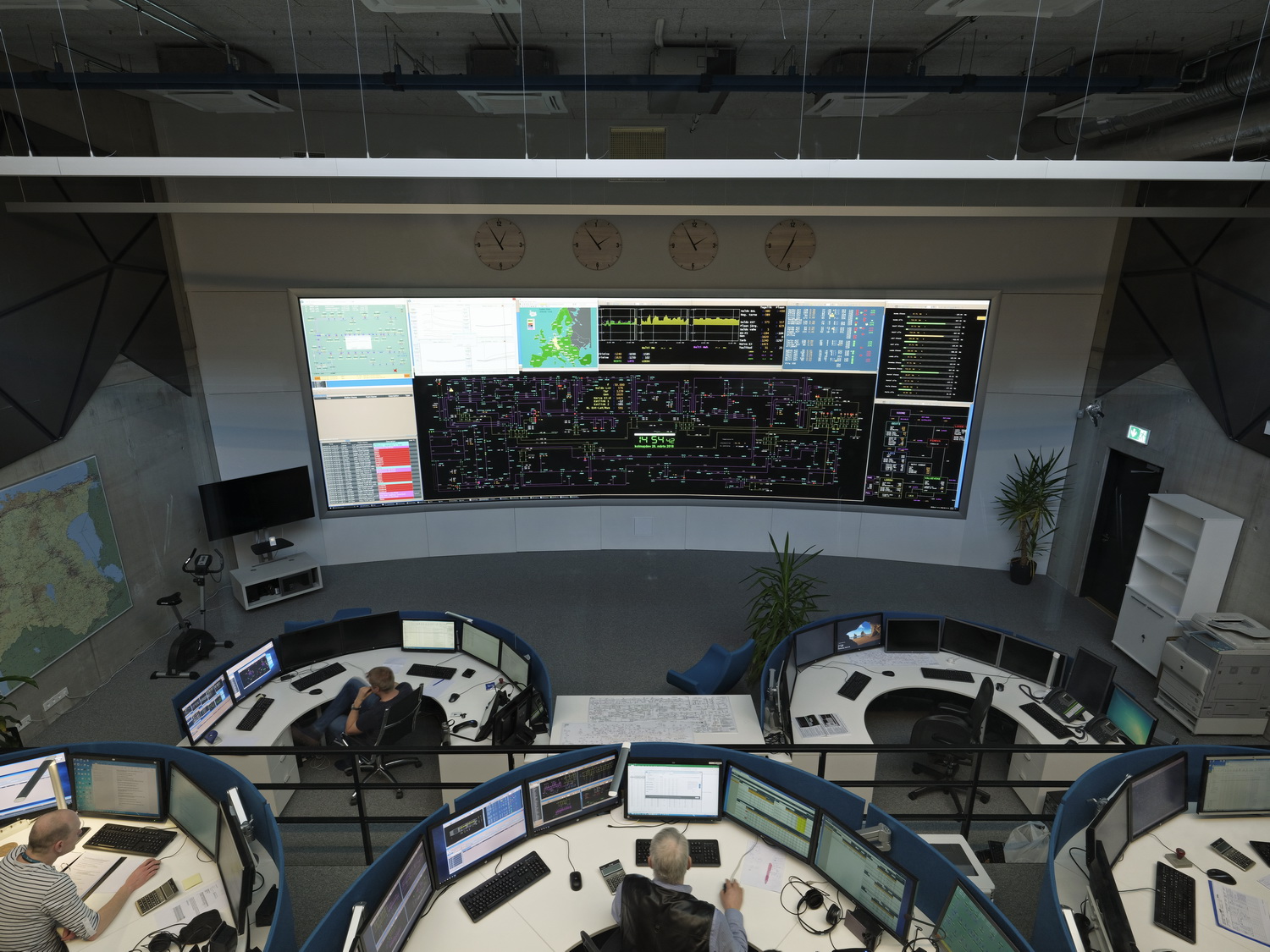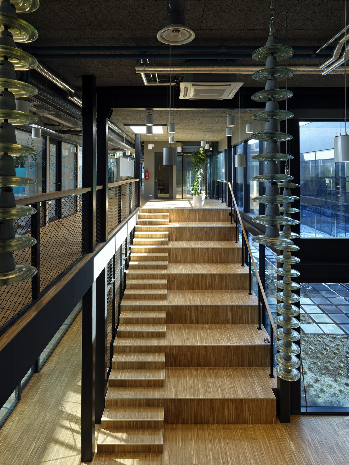 The interior, designed by Stuudio Oü, features a design that similarly echoes the building’s utilitarian function. Spiraling stairwells, built of concrete and steel, vertically course through the east and west elevations of the headquarters, while exposed pipes, cables, and pendant lamps made of recycled insulators line the ceiling and walls. A central vegetative courtyard and a two-story, wood-paneled stairwell, with steps of varying size, are the office block’s principal communal areas. At the core of it all lies the “Brain,” where the nation’s energy transmission network is surveilled through a hippodrome of monitors.