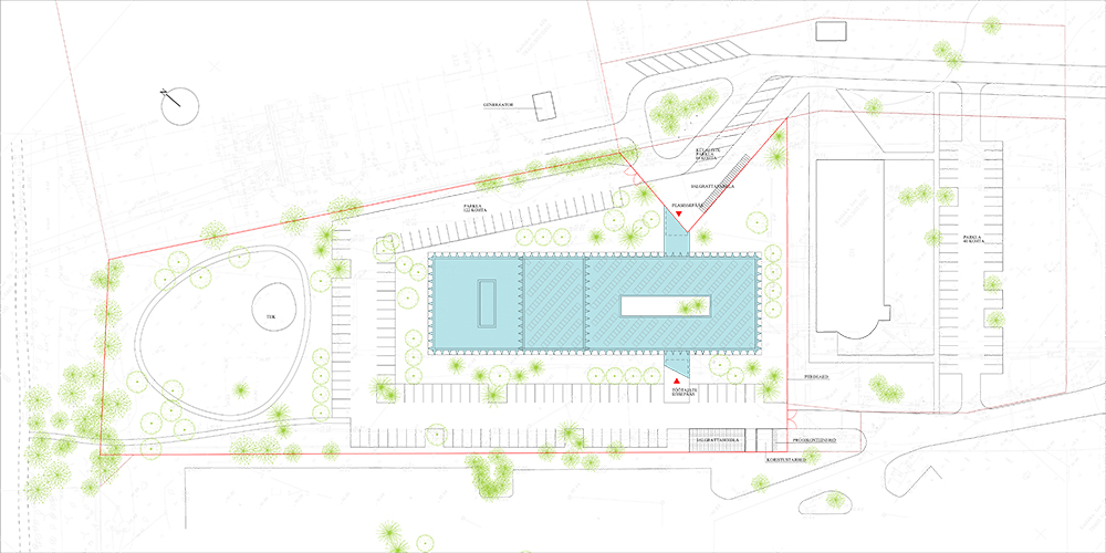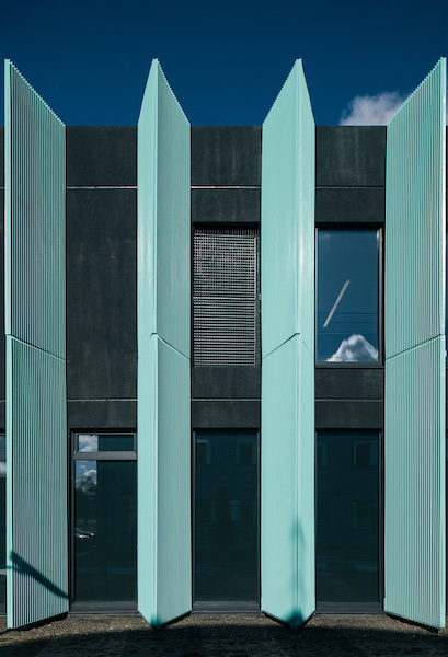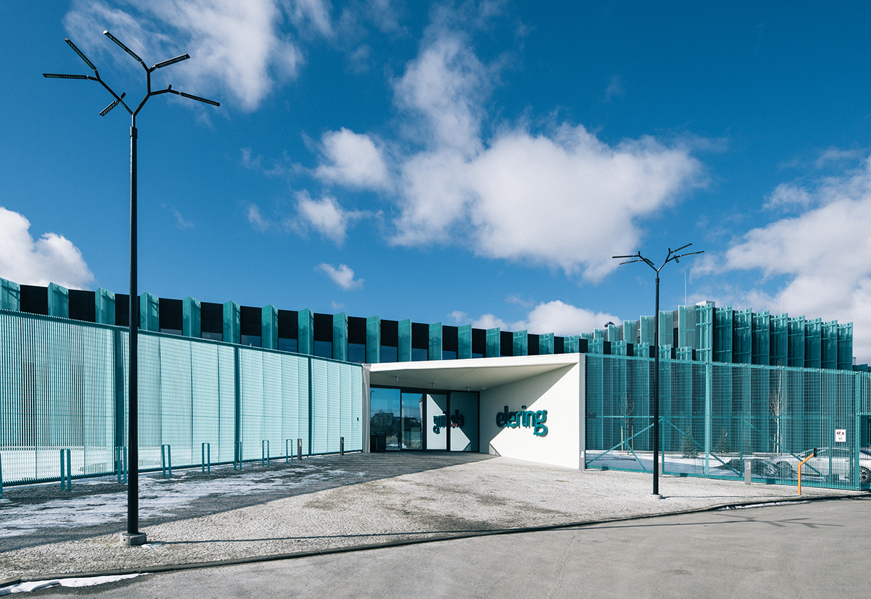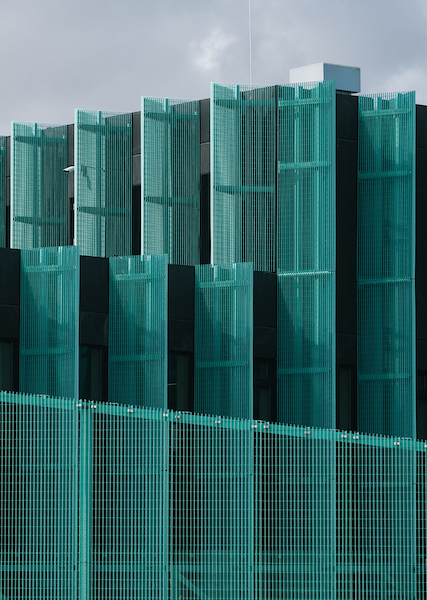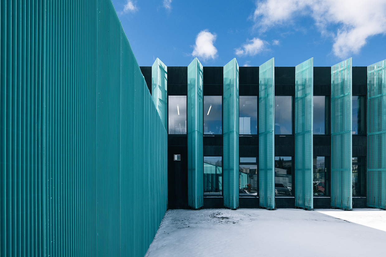 The design of the complex references the spindly and bundled power line, a ubiquitous feature across urban landscapes. AS Elering operates a multi-acre electrical substation next door. According to design lead Karli Luik, molumba envisioned the project as “the brain of the electricity and gas transmission network, monitoring and administrating their vitally important circulation.” As a vitally important aspect of Estonia’s energy infrastructure, the entire 40,000 square-foot complex is ringed by a perimeter wall fashioned of the same turquoise aluminum screen.