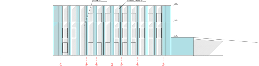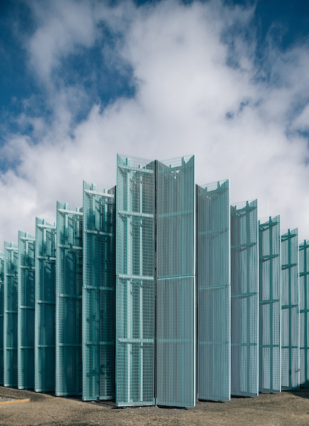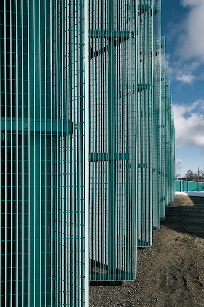 Over 140 turquoise mesh piers ring and visually buttress each elevation, a play on historical castellation and Gothic design found throughout Tallinn’s Old Town. The piers are built of full-length aluminum strips measuring 12 to 41 feet, which are in turn welded to a series of connecting bars. Each pier possesses its own steel support structure consisting of two internal, vertical columns fastened to the welded connecting bars.