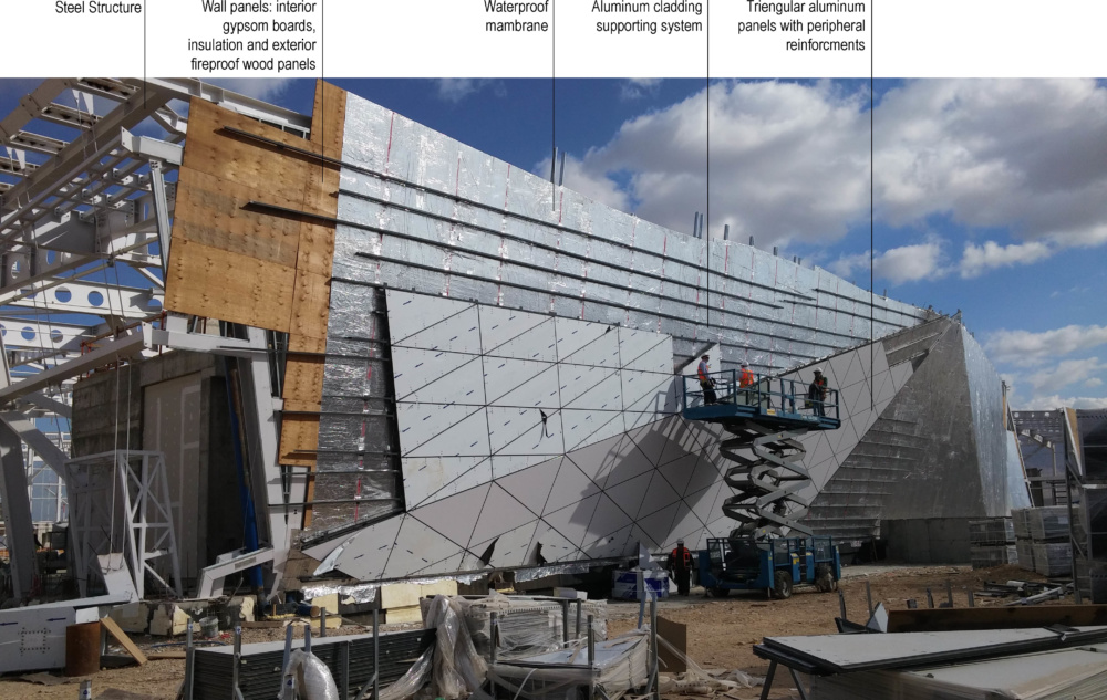 After the initial form of the airport was decided on, the design team used parametric software to determine the dimensions of cladding elements—the largest is just over seven feet wide. The sheer size of the panels and their irregular shape required the use of reinforcements along their edges, which were then fastened to a supporting system of aluminum profiles.