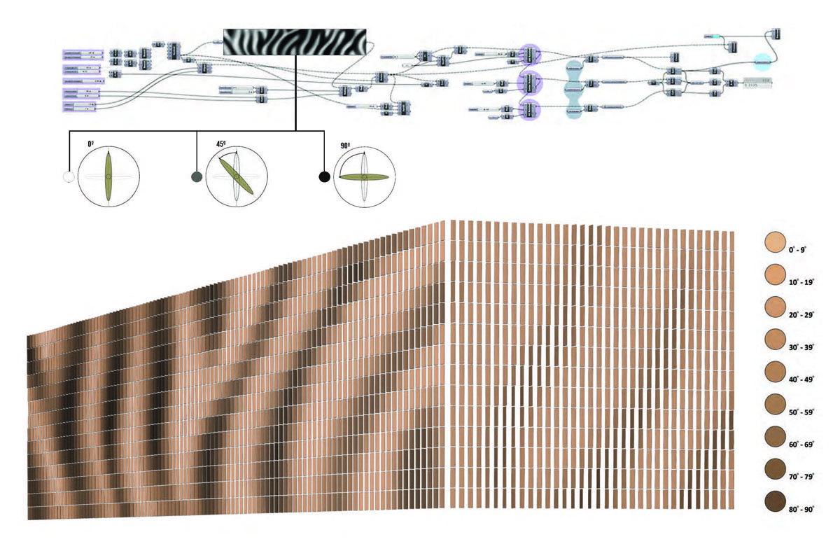 Each louver has a unique rotation which results in an pixelated pattern stretching across the three continuous facades. Every louver’s angle of rotation is set with screws and required coordination with the subcontractor to achieve the specific angle. As seen in the diagrams, when viewed as a whole, the facade emulates the waves of sand dunes and other natural patterns contextual to the region.