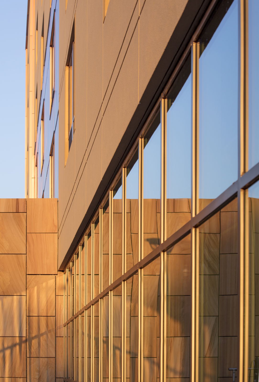 There are two primary facade systems at work on the southern-facing portion of the residence hall. The first is a system of perforated aluminum vertical louvers. The second system is a sandstone panel facade with punched aluminum windows. The remaining portions of the building are clad with insulated metal panels and perforated aluminum screens that link the building’s massings together. SCB chose a material palette which was reflective of the surrounding desert context.