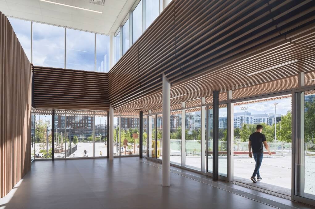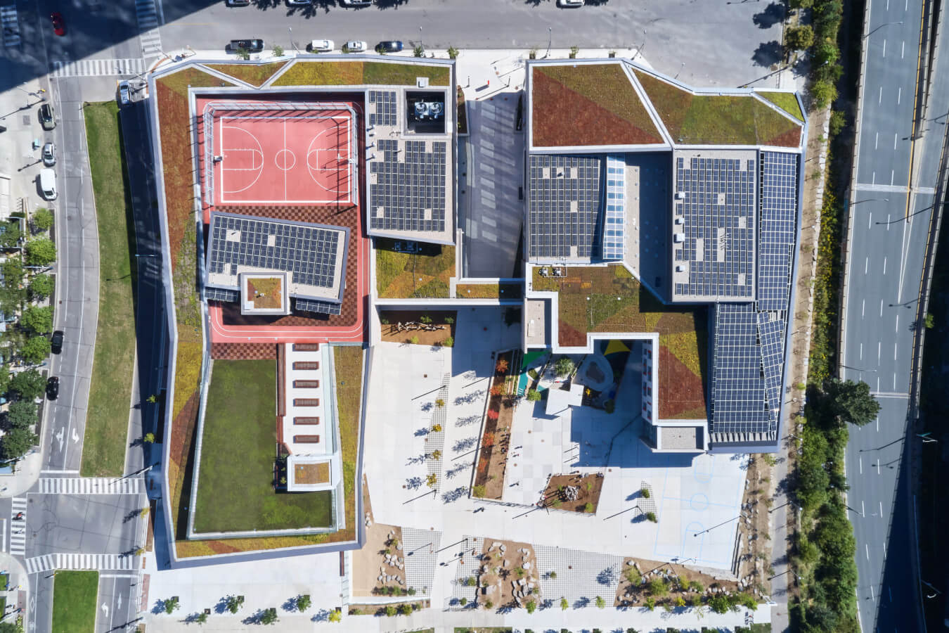 The high-rise residential towers that loom over the site led the design team to consider the roofs of all three buildings as a “fifth facade” from the beginning. This realization led to an extensive green roof planted with sedums, wild meadow, and grass that is visible to neighboring eyes from above as well as from pedestrians on the street.