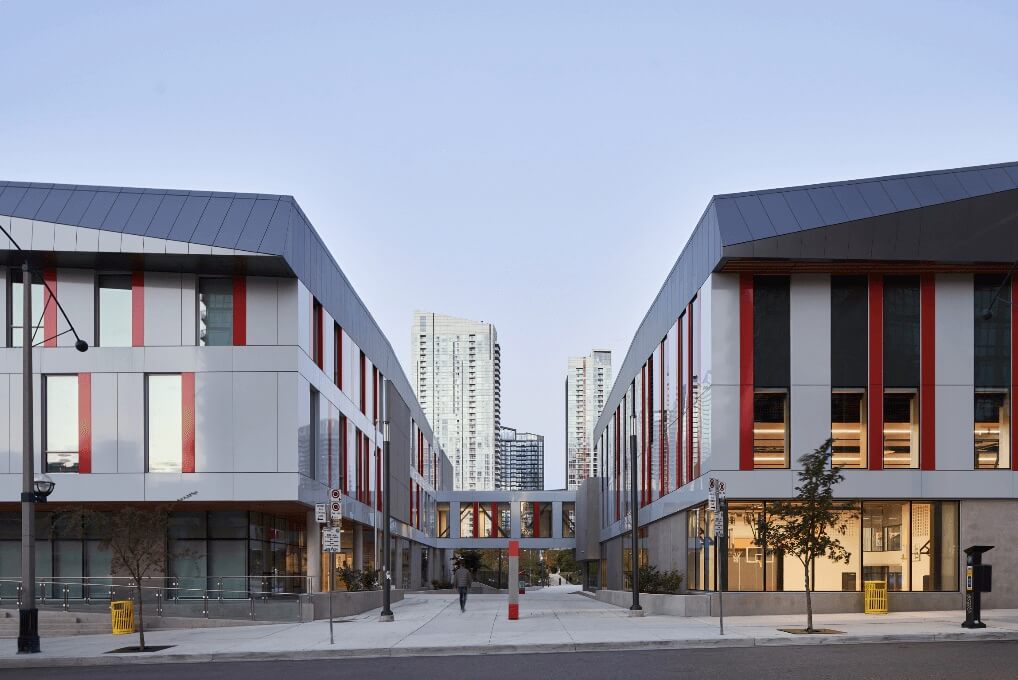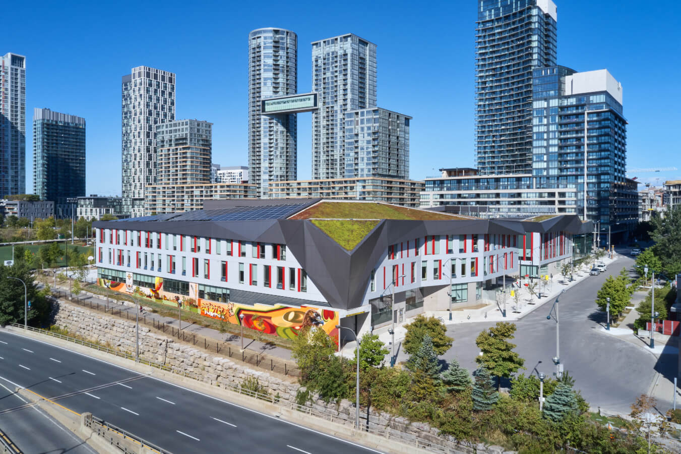 Situated in downtown Toronto’s sprawling CityPlace residential district, Canoe Landing Campus is a mixed-use complex that brings life and a spot of color to a 3.3-acre lot that had sat empty for years. The $65 million, 158,893-square-foot compound introduces vertical community in a drastically different manner than the tall, blue-gray towers that have dominated the neighborhood since the late-1980s.