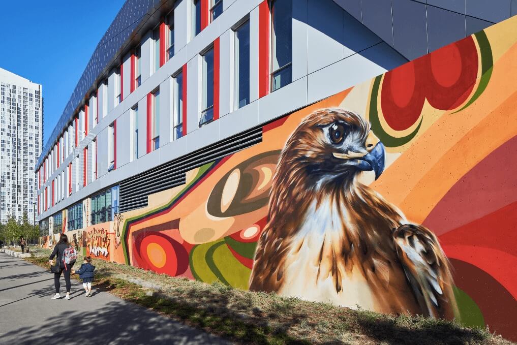 Following the line of sight to the top of the campus’s trio of two- and three-story buildings, its layered program is simply communicated: public space and amenities on the street level become dense vegetation while a basketball court covers the roofs of one building. The designers at ZAS Architects + Interiors—a Canadian firm with offices in Toronto, Vancouver, and Dubai—worked closely with residents and city officials to meet the many requirements demanded of a major public building. The site boasts two schools, a childcare center, public and private parks, fitness facilities, a public art plaza, a mural by Alexander Bacon and local Anishinaabe artist Que Rock, and more.
