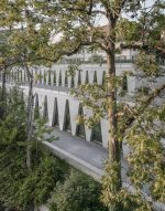 The Tanzhaus Cultural Center is located on the banks of the Limmat River in the center of Zürich, Switzerland, surrounded by a diverse assemblage of historic and post-war structures of varying scales. An intervention in such a setting has the potential to both improve public lands adjacent to the riverfront and strengthen the overall streetscape, and Barcelona-based architectural practice Estudio Barozzi Veiga rose to that challenge with a tiered concrete structure partially burrowed within the riverbank.