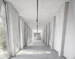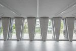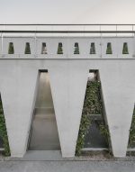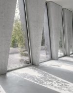 From the Limmat River, the cultural center rises as a two-tiered structure built of Liapor insulating concrete—a material chosen for its thermal performance and structural strength. The finish, light-grey in shade and smooth in texture, is similar to large blocks of stone ashlar assembled in a quasi-rampart format. Barozzi Veiga’s drive towards contextualization is furthered through the trapezoidal arrangement of the concrete formwork, which is an interpretation of traditional load-bearing pillar and beam construction. Throughout the design process, the design team and manufacturer collaborated closely to develop the structural facade, testing an array of cement types and visiting a number of prior projects built by Liapor.