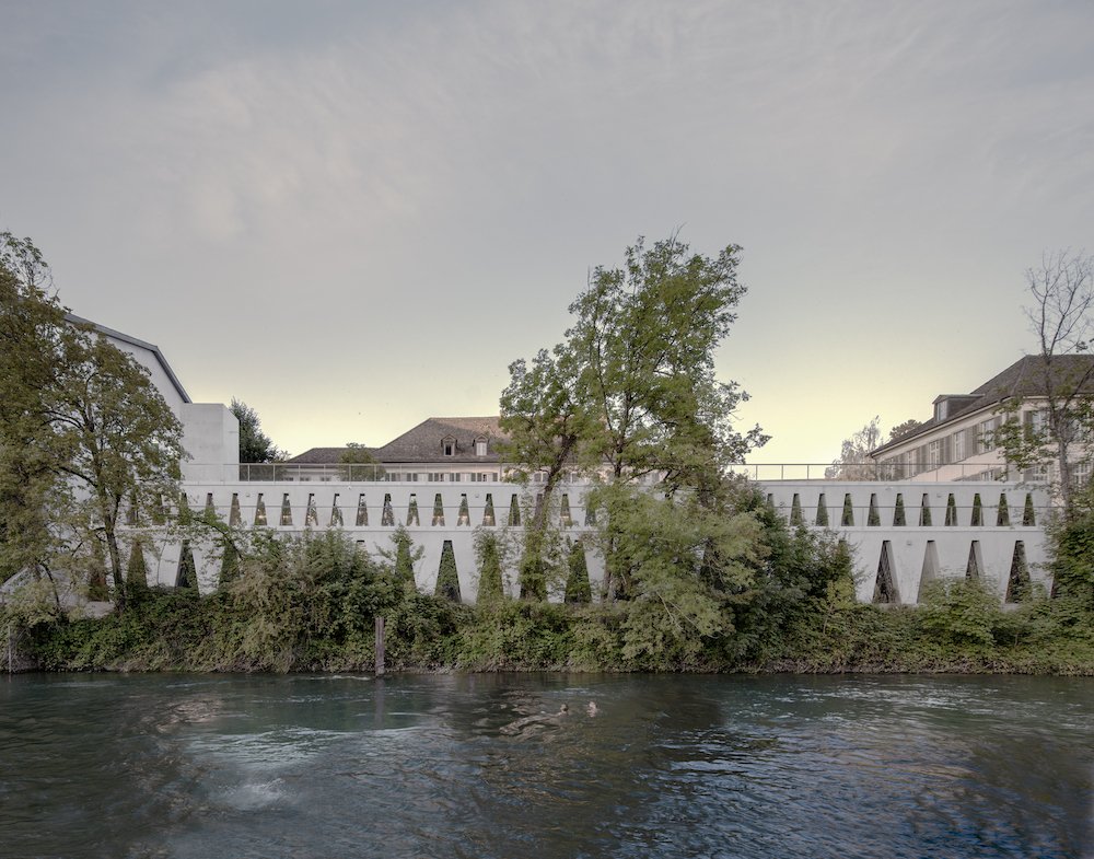 From the Limmat River, the cultural center rises as a two-tiered structure built of Liapor insulating concrete—a material chosen for its thermal performance and structural strength. The finish, light-grey in shade and smooth in texture, is similar to large blocks of stone ashlar assembled in a quasi-rampart format. Barozzi Veiga’s drive towards contextualization is furthered through the trapezoidal arrangement of the concrete formwork, which is an interpretation of traditional load-bearing pillar and beam construction. Throughout the design process, the design team and manufacturer collaborated closely to develop the structural facade, testing an array of cement types and visiting a number of prior projects built by Liapor.