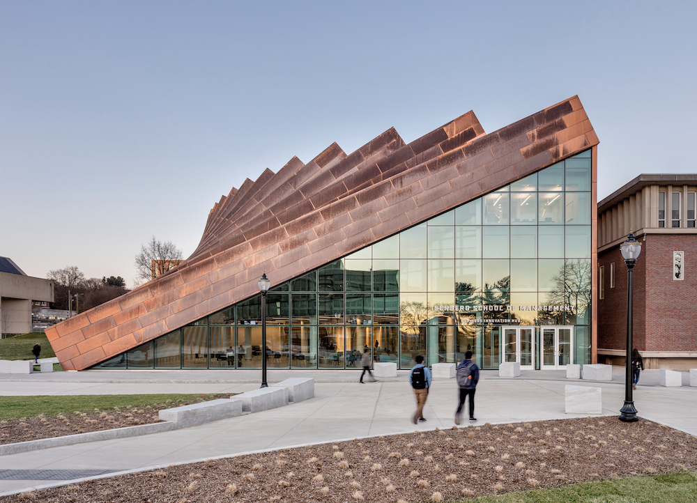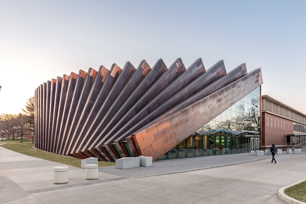Located on the outskirts of Amherst, Massachusetts is a new expansion for the University of Massachusetts Amherst’s Isenberg School of Management. The building, designed by Bjarke Ingels Group (BIG) in collaboration with architect-of-record Goody Clancy, adds a new 70,000-square-foot study and social space for approximately 150 faculty members and 5,000 students. The massing of the extension resembles the imposing circular layout of an ancient amphitheater, swapping out the Roman arch or Greek pillar for facade-height strips of copper cladding and glass curtain. For the bulk of the enclosure, the copper-clad concrete piers rise perpendicular to the ground level, but ultimately stagger and fall atop each other in a domino-like effect.