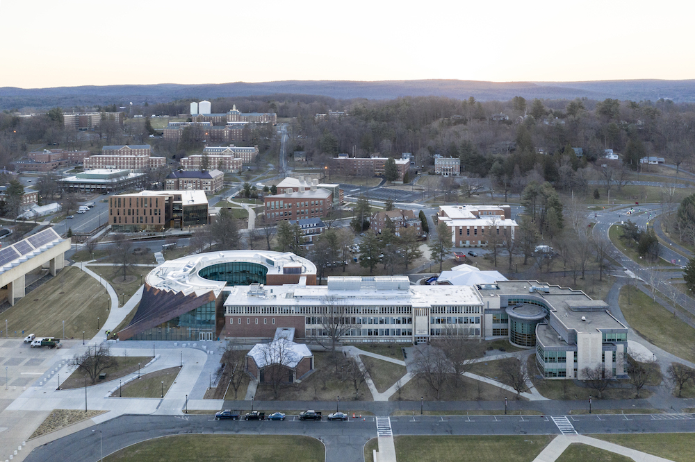 UMass Amherst is the flagship campus of Massachusett’s state university system, and as a result, possesses a broad range of architectural styles and building scales. The Isenberg School of Management moved to its current site in 1964, a rectilinear three-story building defined by concrete and red brick. An extension was added to the southern elevation of the original building in 2003, and BIG’s design effectively continues this trend of growth along the north elevation.