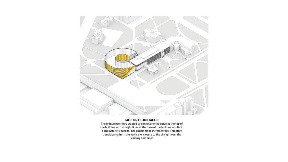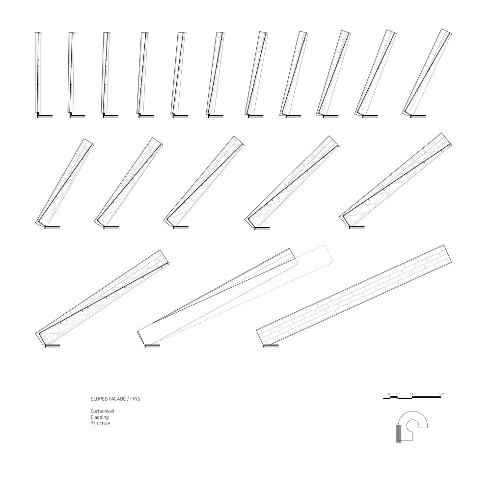 The primary stylistic flourish of the project is the domino-like effect found at the entrance of the building, a remarkably complex structural feature that remains visually consistent. “Even before they start to pitch, the depth of the pillars from the glass gradually increases,” said Goody Clancy Senior Associate George Perkins. “The first few pitched pillars are framed with steel studs, but then structural steel tubes are introduced, and eventually steel trusses. The metal panels and joint locations had to negotiate this changing structural condition.”