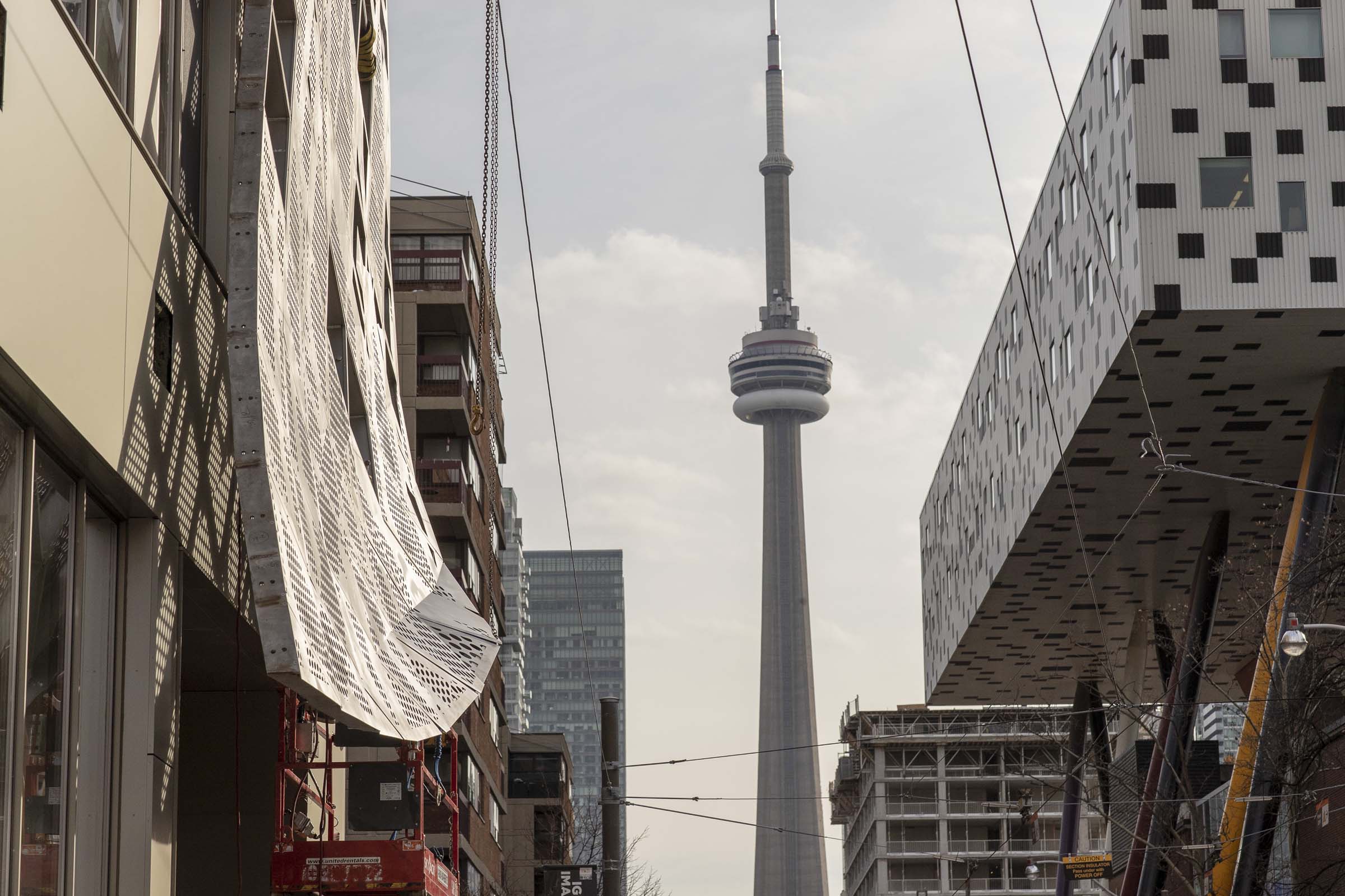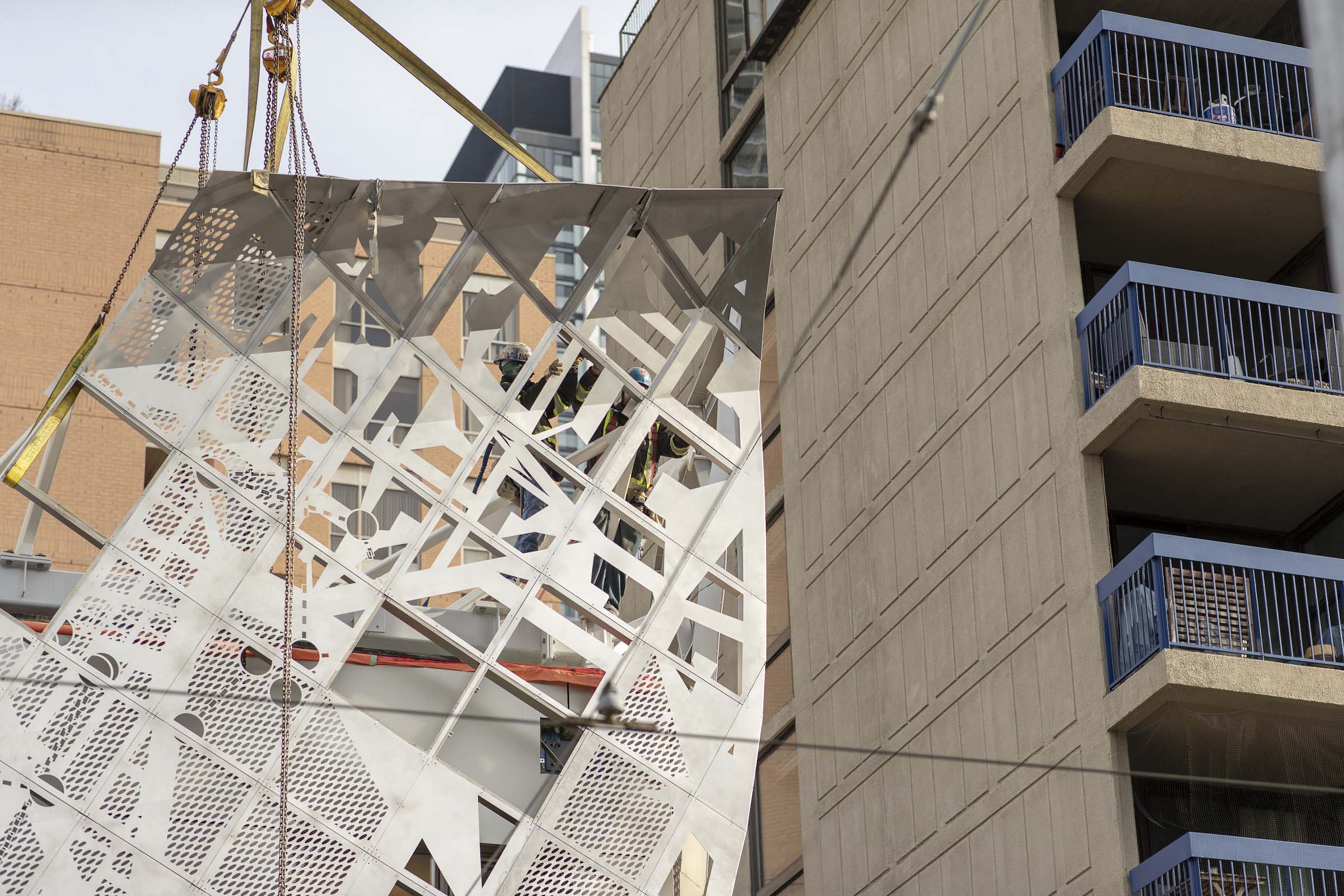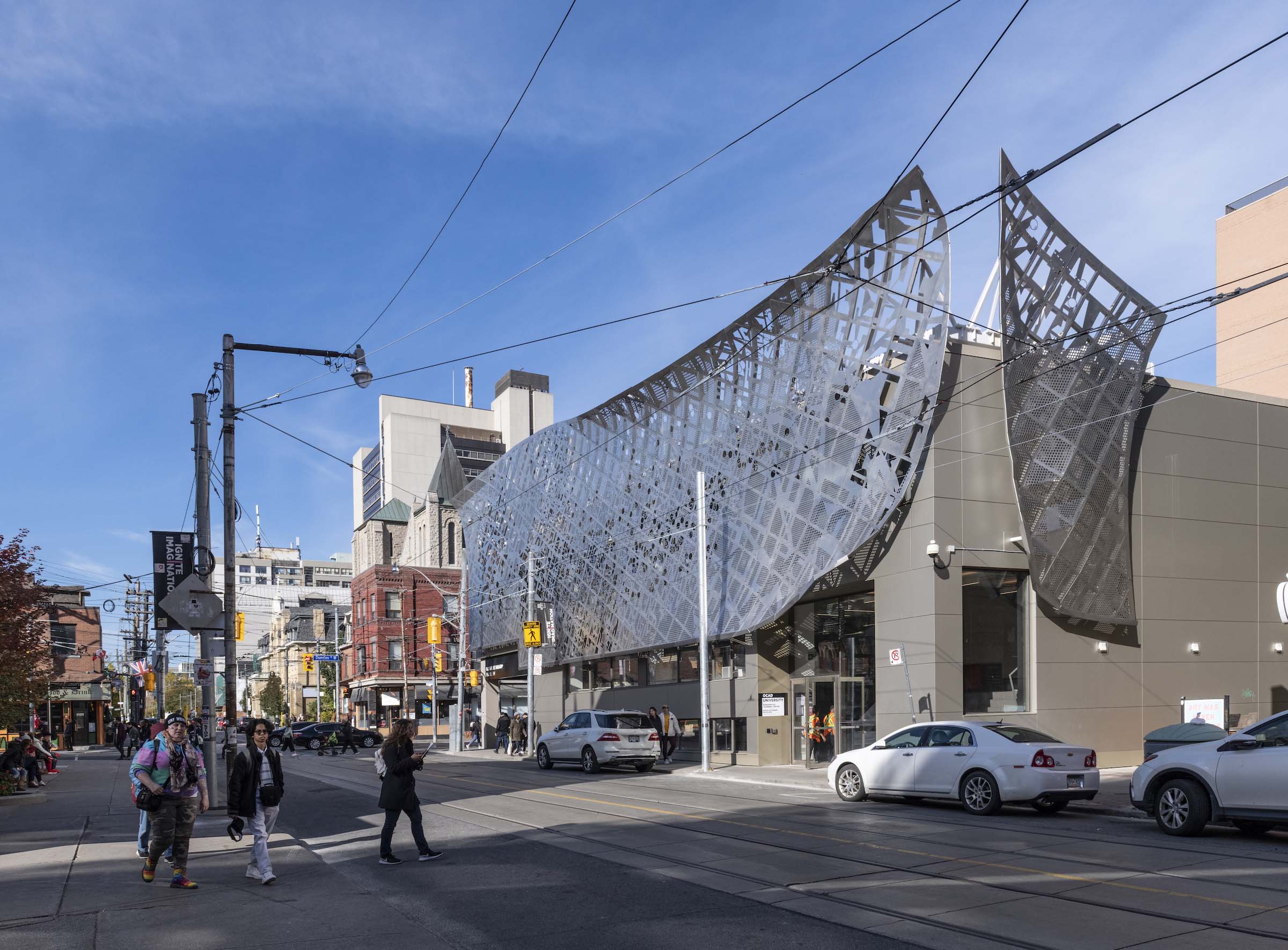 Manufactured in 19 modules to facilitate transport, the facade modules are suspended by a series of outriggers that are fastened to the concrete structure. The scrim hangs from a triangulated steel structure above the roofline that distributes the load down through the existing columns of the building. A considerable challenge for the team was the extensive permitting and approval process given the zero lot lines, busy downtown streetcar system, and portions of the facade extending into the public right of way. The upper edges of the faceted envelope can be seen curving over utility lines like a pole vaulter at its peak. Notably, the team worked closely with the Art Gallery of Ontario to park a crane on their property, aiding the 10-day install that occurred over 4 months.