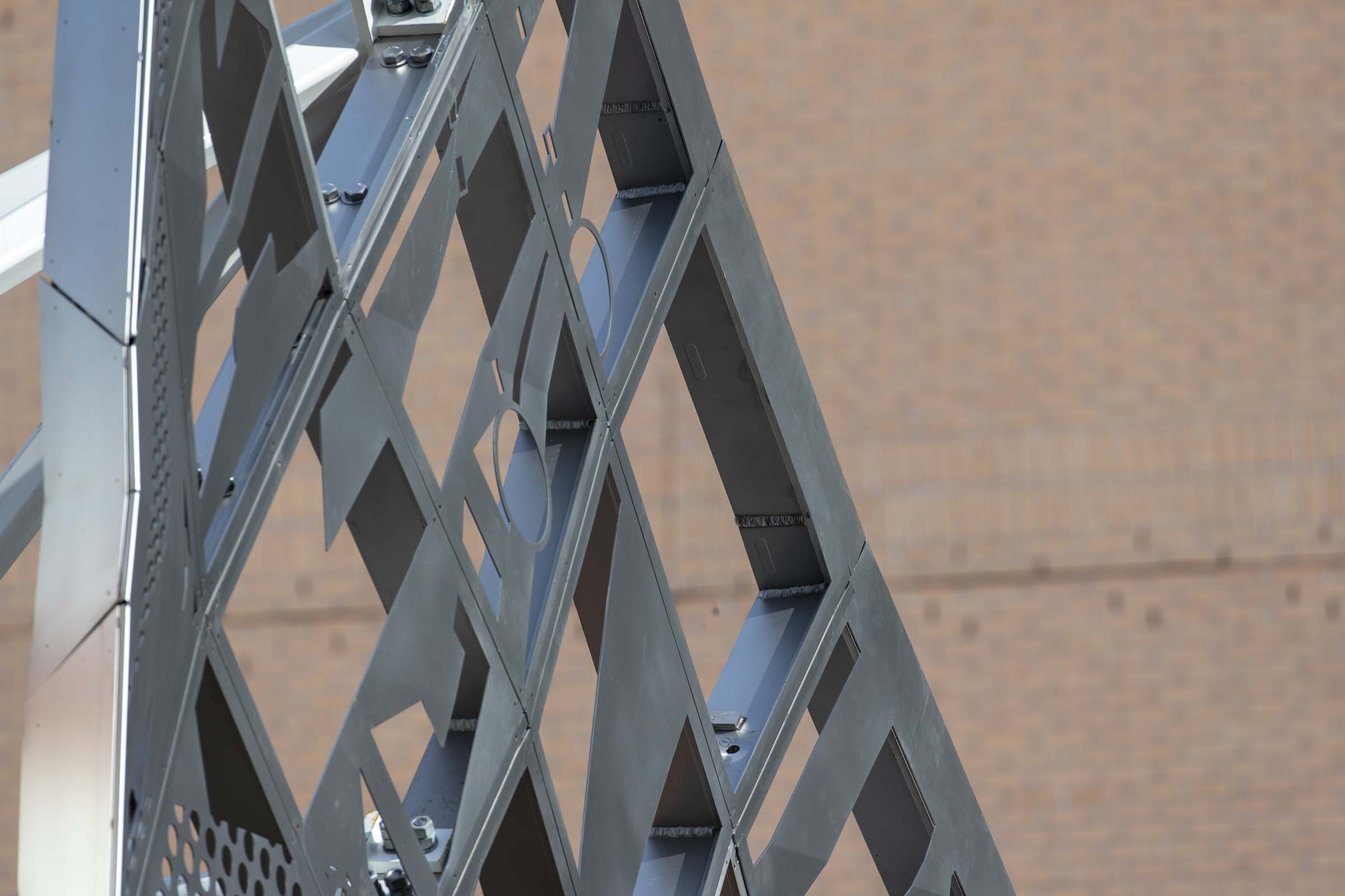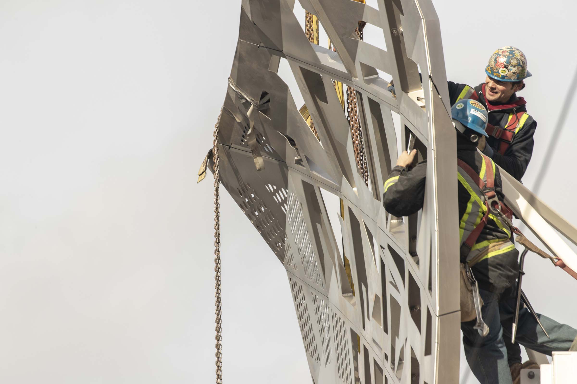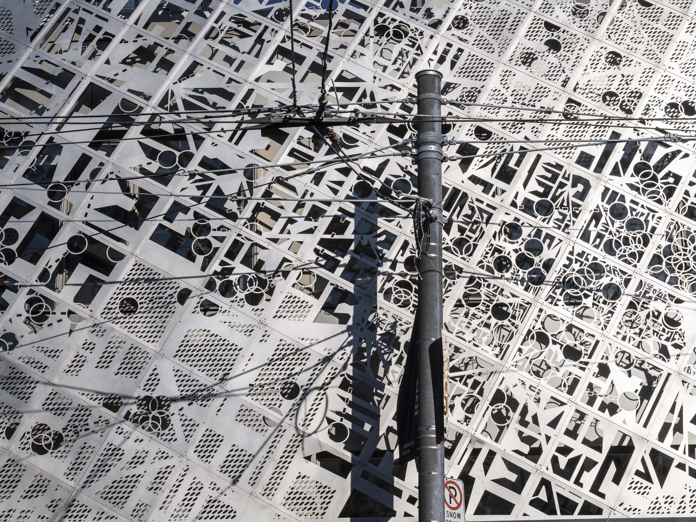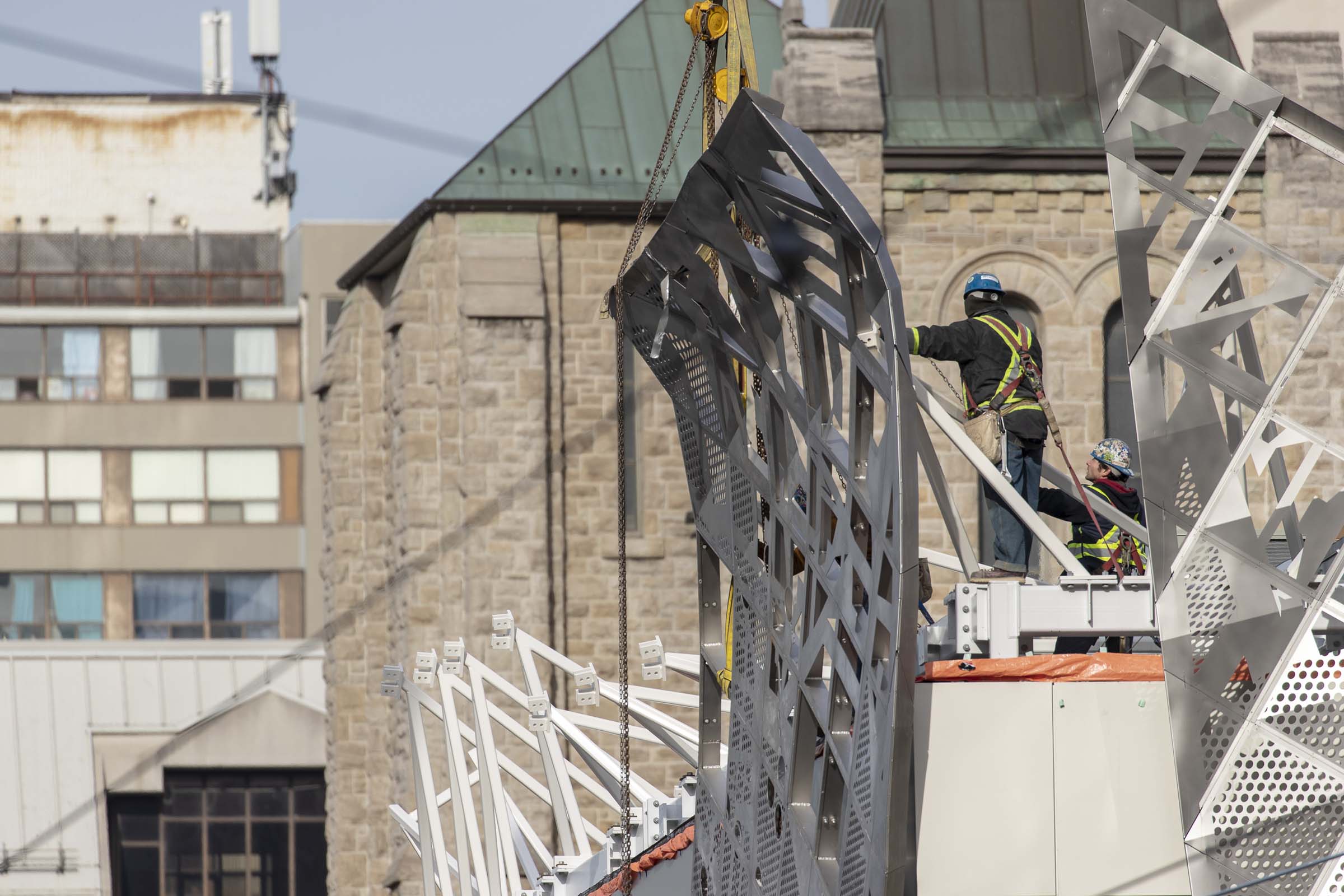 Manufactured in 19 modules to facilitate transport, the facade modules are suspended by a series of outriggers that are fastened to the concrete structure. The scrim hangs from a triangulated steel structure above the roofline that distributes the load down through the existing columns of the building. A considerable challenge for the team was the extensive permitting and approval process given the zero lot lines, busy downtown streetcar system, and portions of the facade extending into the public right of way. The upper edges of the faceted envelope can be seen curving over utility lines like a pole vaulter at its peak. Notably, the team worked closely with the Art Gallery of Ontario to park a crane on their property, aiding the 10-day install that occurred over 4 months.