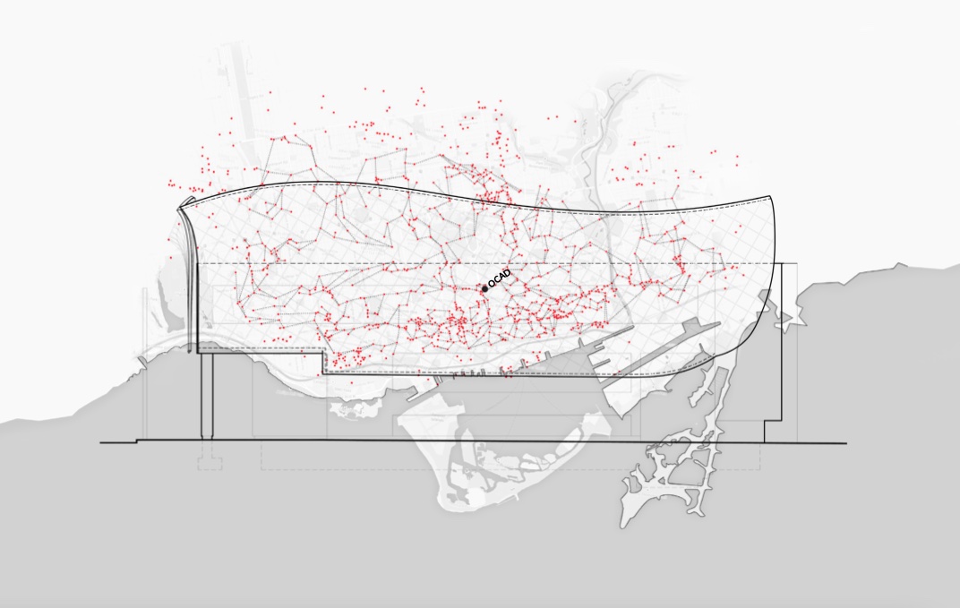 As our production of data continues to explode, it’s only natural that that output found its way into architectural design. A new patterned facade at the Rosalie Sharp Pavilion used mapping data to convey a complex web of Toronto’s public artwork, artistic communities, and density of living and working artists for the Ontario College of Art and Design University, the leading design and media program in Canada. The result is a striking ocean of information, layered beyond measure, sitting at the active city corner of Dundas and McCaul streets where students, pedestrians, and streetcars frequently pass by. Local think tank and architectural design firm Bortolotto transformed the school’s existing office building into 18,000 square feet of student work and exhibition space.