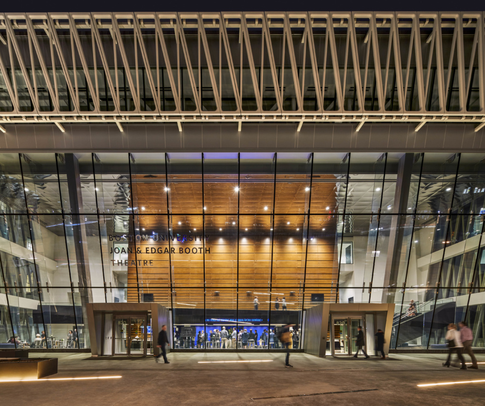 Commonwealth Avenue, snaking from the Boston Public Garden through the greater metropolitan area, is no stranger to significant cultural venues and institutional buildings. Boston University’s Joan & Edgar Booth Theatre and College of Fine Arts Production Center, by local firm Elkus Manfredi Architects, joins this assemblage with an angled glass curtainwall shrouded in a scrim of ultra-high-performance concrete (UHPC) and flanked by vertical strips of metal panels.