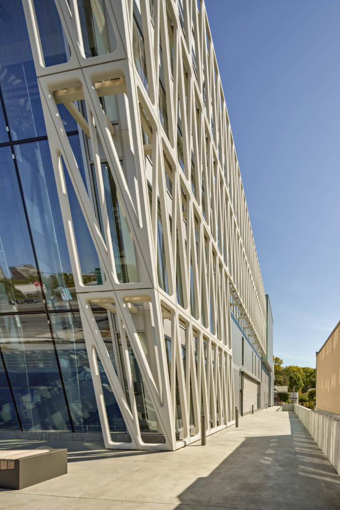 The 75,000-square-foot building rises to a height of approximately 57 feet and largely follows a rectangular massing. While the majority of elevations rise perpendicularly from the ground level, the north elevation is defined by a 42-foot-tall glass curtainwall tilted at a 14-degree angle. The glass panes, measuring 7-feet-by-14 feet, were structurally adhered on site and lifted into place using a custom steeling rigging system.