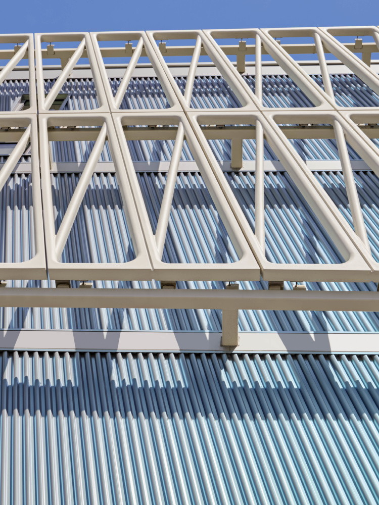 A scrim of UHPC panels frames the primary northern elevation and folds onto the east and west elevations, a design feature intended to evoke a proscenium screen shrouding the entrance of the theater. In total, there are 83 UHPC panels measuring 14-feet by 7-feet, each weighing approximately 1,600 pounds. Tubular steel outriggers, cantilevered from the slab edge and running horizontally, serve as a platform for the concrete panels.