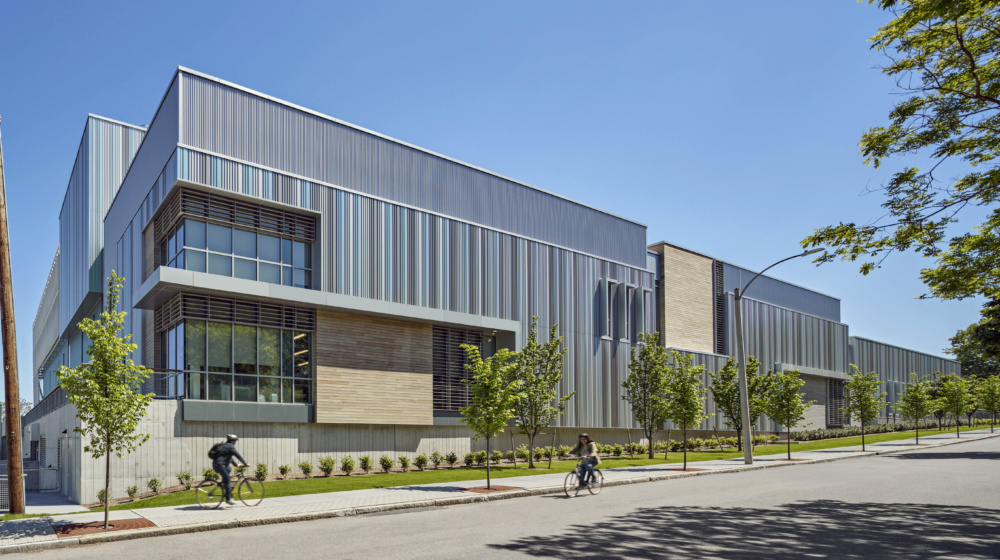 The relative formality of the south elevation, along Dummer Street, is a response to the immediately adjacent residential neighborhood. Throughout the design process, the design team met regularly with the surrounding community to address their concerns. The use of Ipe wood softens this elevation and links it materially to it wooden dropside neighbors, while louvered windows provide glimpses within.