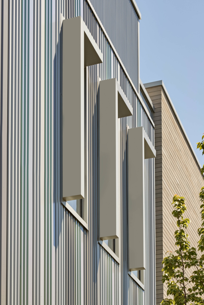 Besides the entrance atrium, there are limited chances of fenestration across the rest of the building due to performance spaces within. For the remaining elevations, the design team opted for Ipe wood and aluminum siding. Produced by Centria, and treated with their Kolorshift PVDF, the aluminum panels reflect different colors depending on their exposure to sunlight—their character effectively morphs according to weather, time of day, and season. This dichroic effect is amplified along the northern corners of the east and west, where the aluminum panels were installed diagonally, producing a wave-like effect of color differentiation.