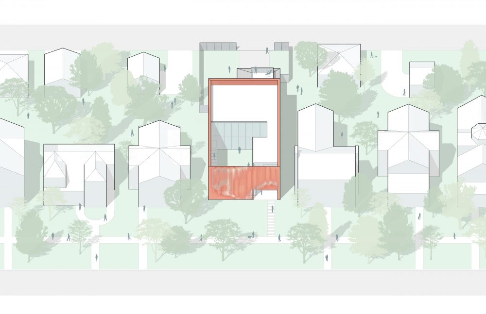 Evanston, Illinois is located over a dozen miles from the city center of Chicago, on the northern fringe of Cook County, and is bounded by Lake Michigan to the east. The city is fairly typical for the region: there is a postwar central business district surrounded by tracts of suburban housing, some clad with wood drop-siding and others with exposed brick. Completed in 2018, the Lipton Thayer Brick House by Los Angeles-and-Florida-based architectural practice Brooks + Scarpa and Chicago’s Studio Dwell burst onto the scene with a twisting-brickscreen backed by a Miesian glass curtain wall.