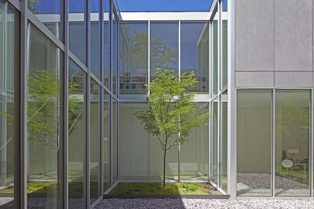 Past the screen wall, the courtyard is lined with rectangular, high-visibility glass curtain wall modules framed with aluminum. Sunlight from the northern exposure is filtered through the screen wall, softening the daylight that reaches the interior spaces. The rear elevation, which faces a service alley, is composed of recycled Portland cement panels stained with LITHOCHROME to achieve a light-grey finish.