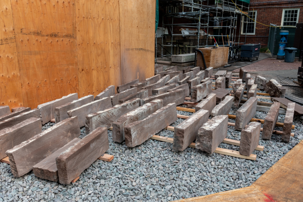 “Ground level stone removals and coring helped to confirm stone thicknesses and wall construction at different locations around the building and from different eras,” said Bruner/Cott principal Henry Moss and preservation architect Adrienne Cali. “Extensive trials for redressing stone surfaces and in situ comparison of stones from multiple source quarries led to final decisions about when to employ inserts (Dutchmen), when to redress, and when to cut full stones longitudinally to expose a new surface and re-bed in original locations with mortar back-up.”