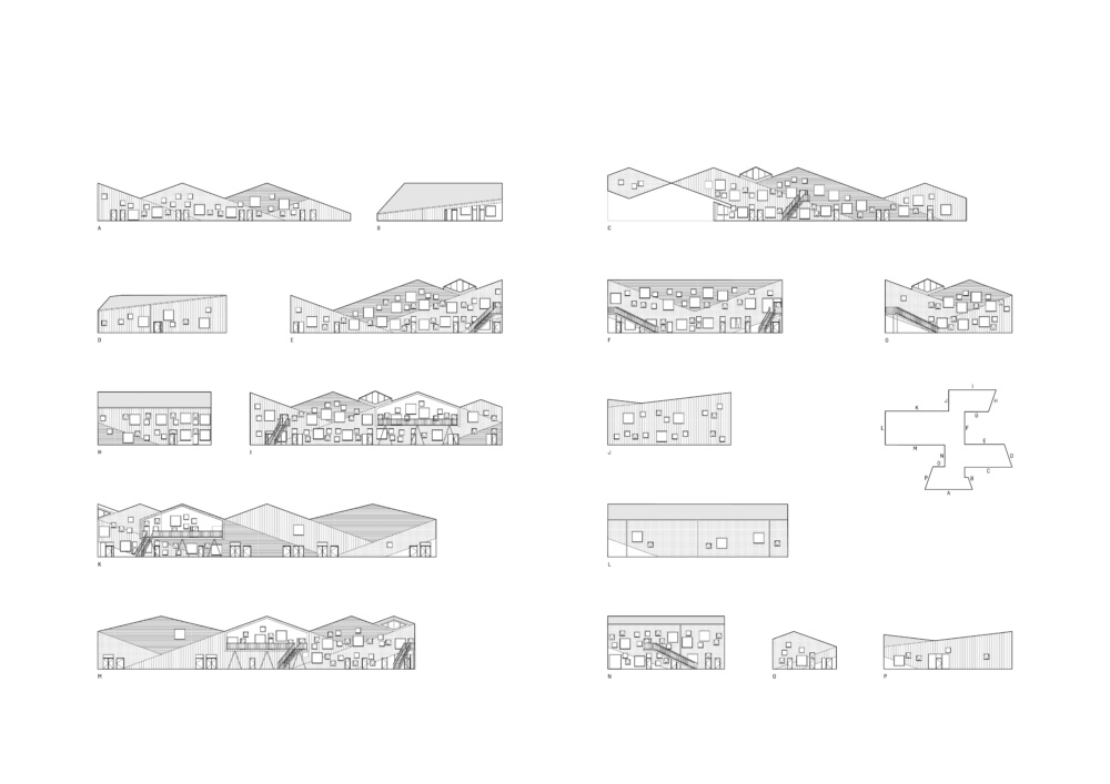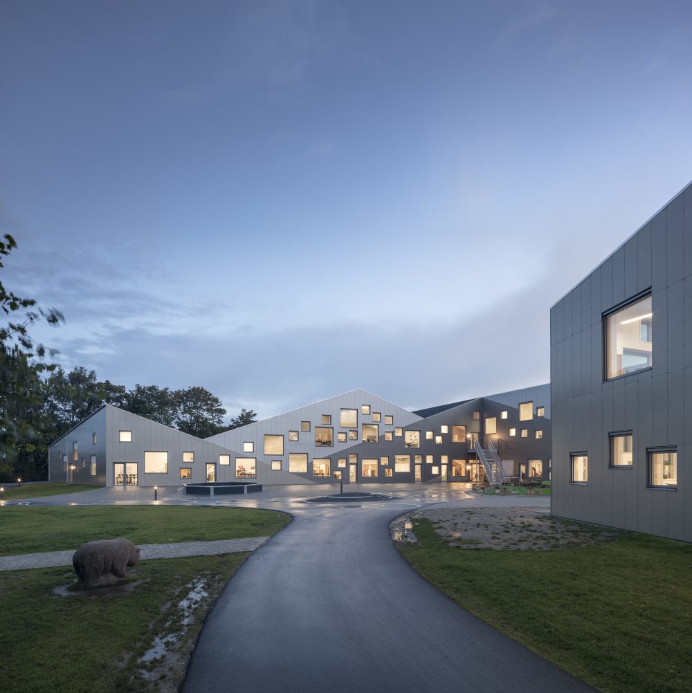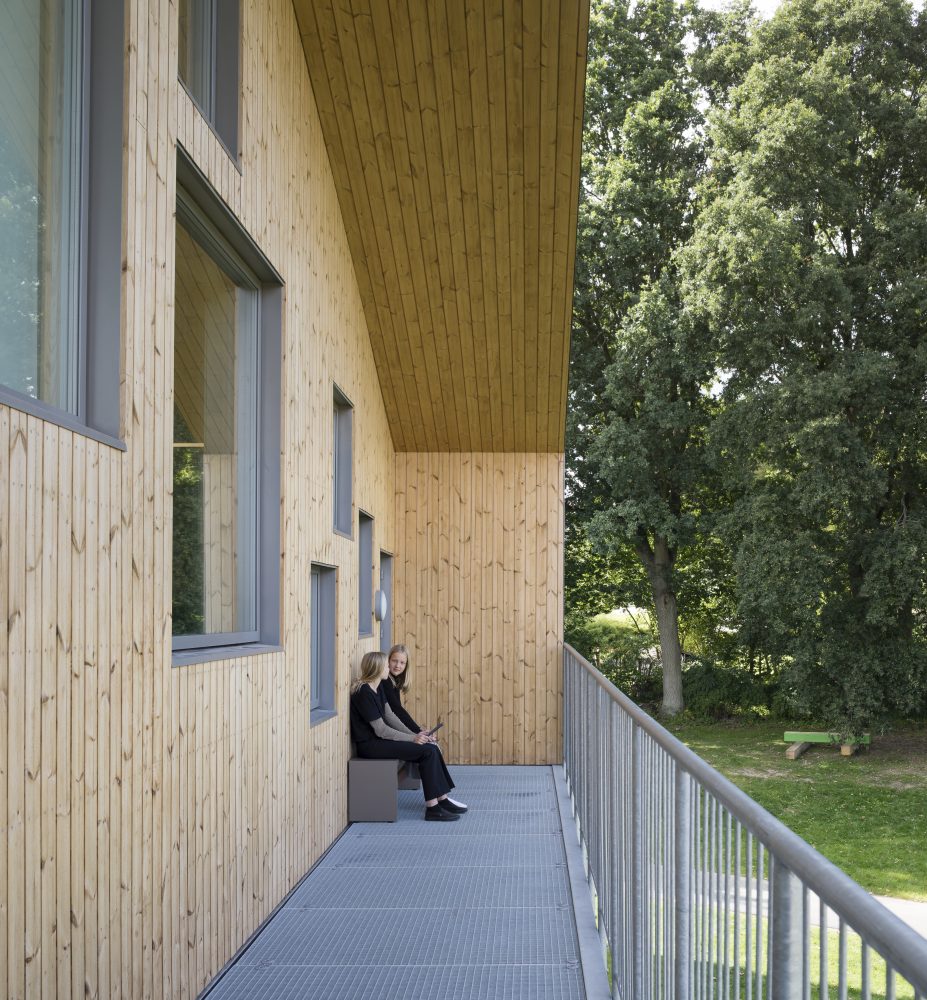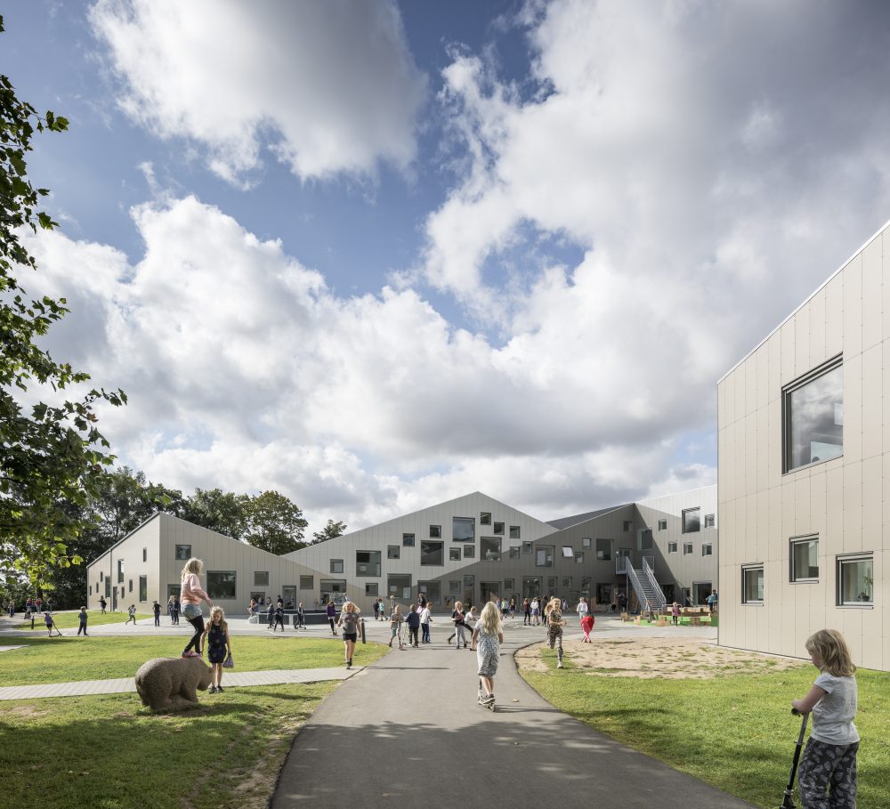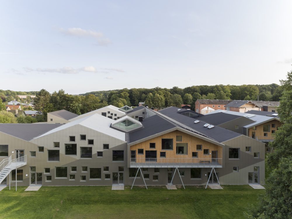 According to CEBRA, the school ties itself to the town aesthetically through a diverse range of pitched roofs; the staggered gables break up the building’s mass and extend to shield balconies from the elements with overhanging eaves. Balcony spaces, entrances, and portions of the interior are paneled with Moelven Thermowood. The school’s structure is composed of pre-cast concrete walls and slabs.