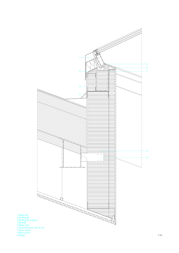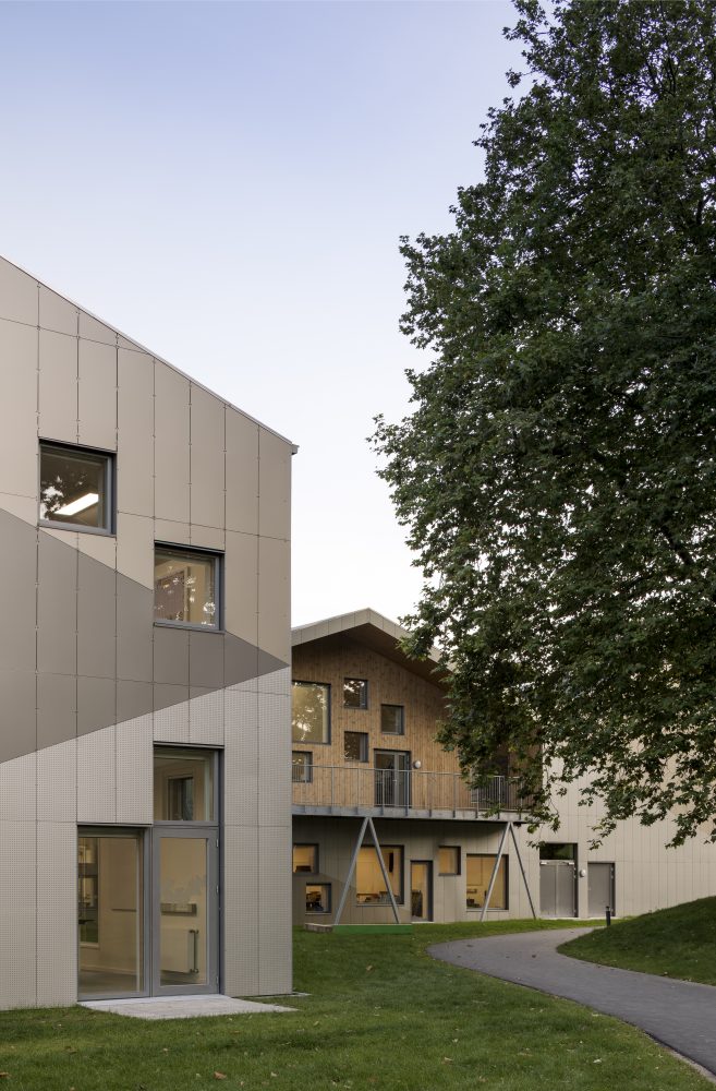 The exterior is largely clad with Alucoil’s prefabricated aluminum composite panels treated with grey, brown, and beige colors. The cladding is mounted on perforated aluminum profiles and fitted to the frames of windows and doors. Segments of color meet at sharp angles, mirroring the panoply of gables above. CEBRA opted for the facade’s earthy tones “to reflect how the colors of the sky transform into the colors of the trees, mediating between the two primary elements surrounding the school.”