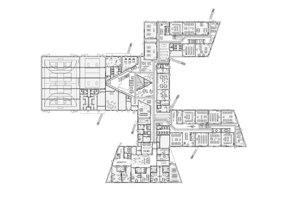 Although the roofline possesses a number of peaks and valleys, the plan consists of “four offset fingers.” Circulation across the expansive layout is facilitated by a series of common spaces, notably a natural light-flooded central atrium. The core space is supported by a series of slender grey columns, allowing for a broad range of uses and internal configurations between. Offset stairwells and a wooden amphitheater ring the atrium, providing routes for circulation and a large area for gathering.