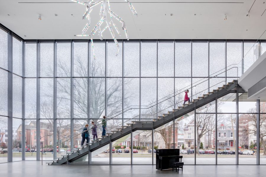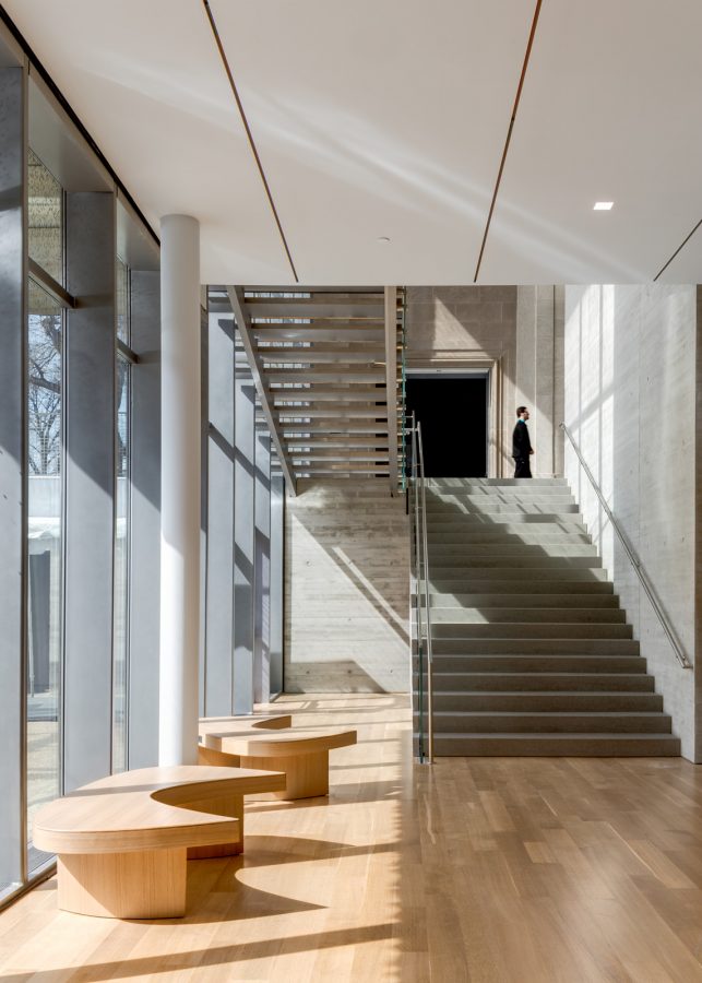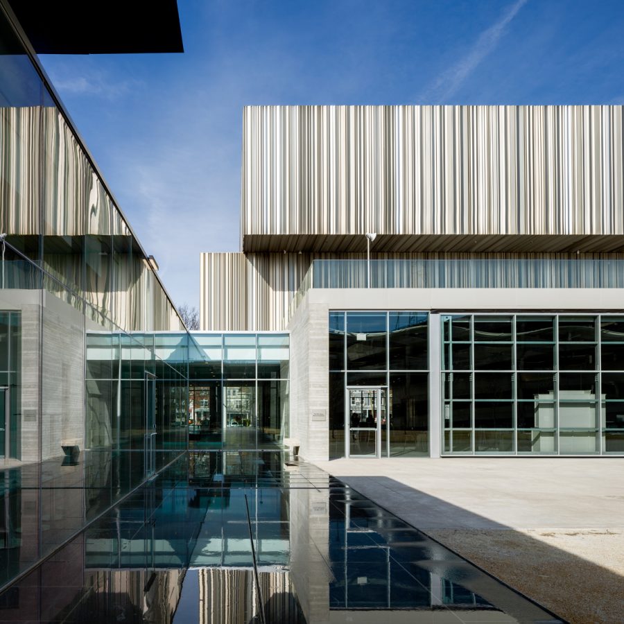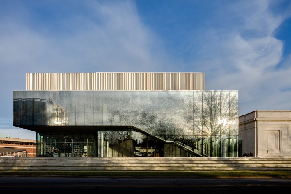 The most prominent component of the project is a 60,000-square-foot north pavilion, formed by stacking three shifted volumes sheathed in fritted glass and folded aluminum panels. This materiality emulates the classical moldings of the original museum building and produces a dynamic change in response to the natural light.