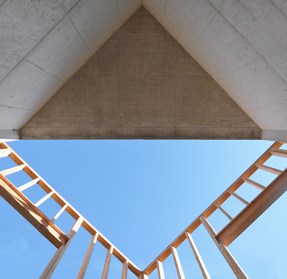 Drawing on the familiar vernacular of wood-framed construction, CLOK views their installation as questioning the relationship between Roche-Dinkeloo’s brutalist intervention and the largely Italianate and Colonial Revival character of the surrounding context. From within the installation, the view upward is sliced in two. Half of the structure is weighed down by a looming triangle of concrete, while the other faces the open sky.