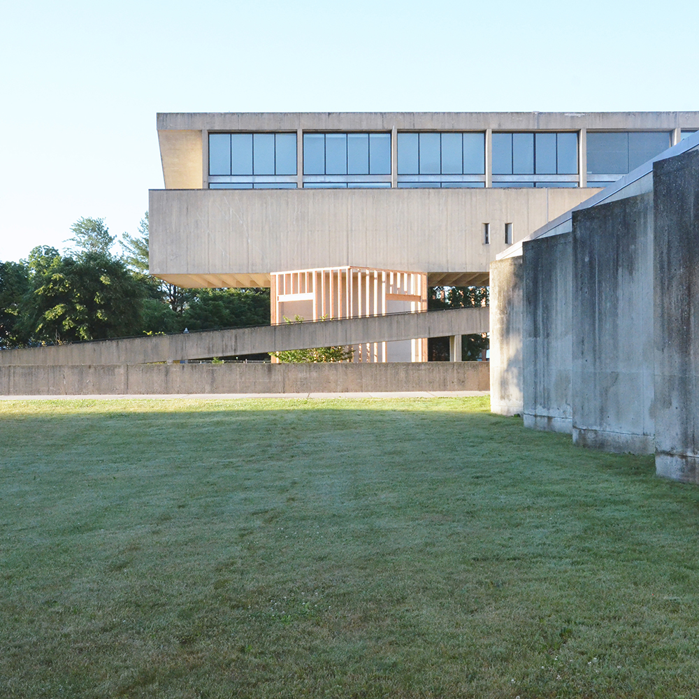 The Fine Arts Center, designed by firm Roche-Dinkeloo in 1975, is located on the border of UMass Amherst’s campus. According to architect Jon Lott, the structure was conceived as “a bridge to the Mass campus, operating as an entry point between the town of Amherst and the academy’s campus. An arcade of V-shaped pillars line the structure’s south and north elevations, supporting studio space above and providing glimpses of the campus’s central quadrangle.