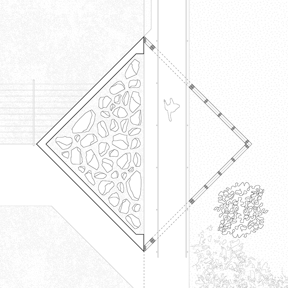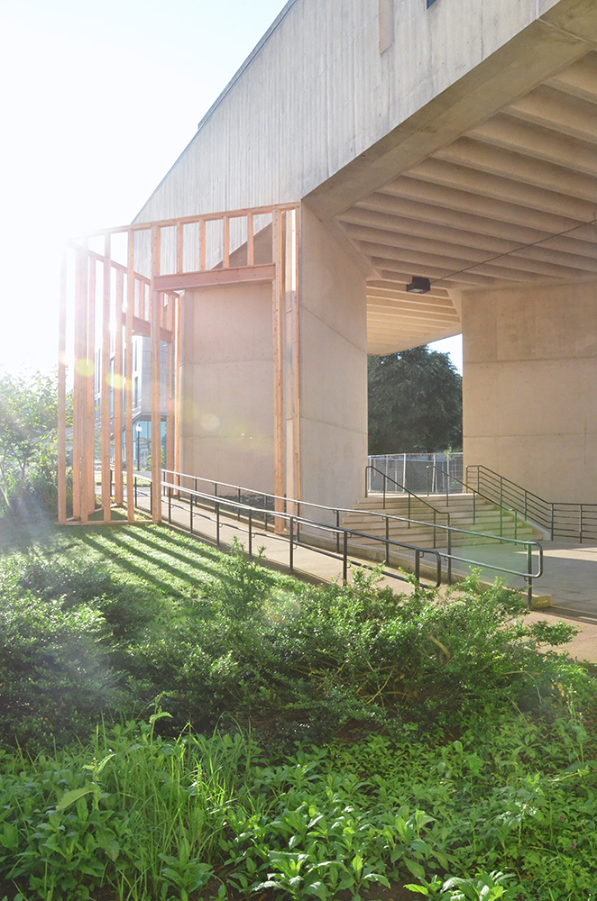 The Roche/Dinkeloo Double is a two-sided wooden frame, measuring 24 feet in all dimensions. To match the scale of the abutting concrete structure, CLOK bundled their Douglas Fir 2 x 4’s to effectively create 4 x 8 super studs. The wood-framed structure meets the corners of the V-shaped pillar, resulting in a diamond-shaped room. A walkway diagonally runs through the installation, embedding it within an actively-used campus thoroughfare.
