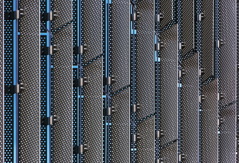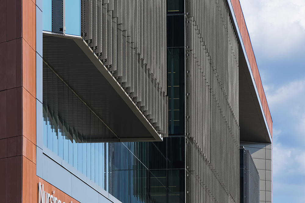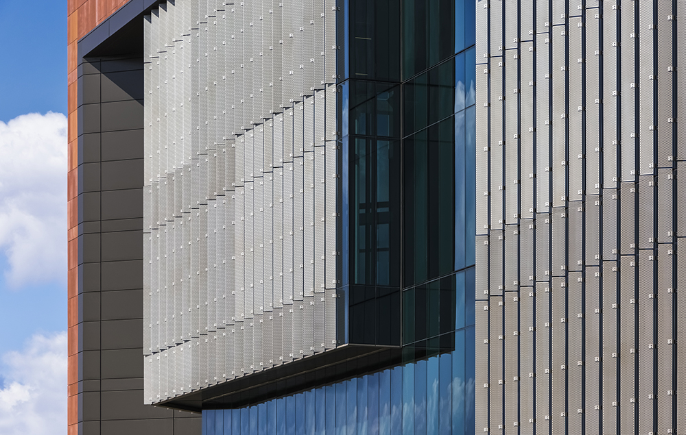 “The facade is composed of two distinctive wall types,” said James Butterfield, RA, design Principal at Perkins Eastman. “One which employs a full-height, vertical perforated metal shading system, and a second which introduces opacified shadowbox panels to minimize the quantity of unshaded vision glass.” Each curtainwall module reaches a height of 30 feet and is anchored at the end of each concrete slab. Aluminum brackets project from the Kawneer-produced wall system and are fastened to the 1/4-inch-thick vertical perforated panels at four points. The overall goal of these devices is the mitigation of solar incidence and internal glare associated with typical large-scale curtain wall design.