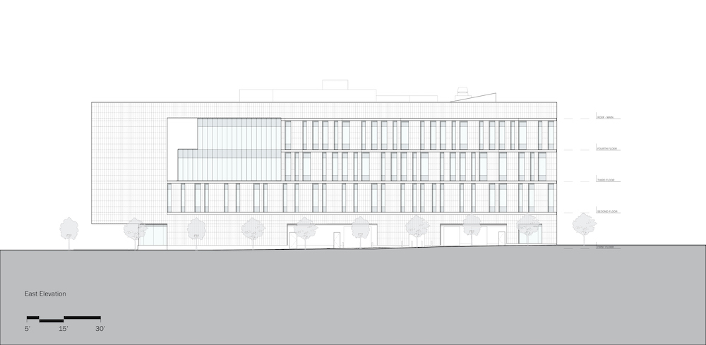 While the rainscreen serves as an oversized framing device, the bulk of the 110,000-square-foot project resides behind glass curtain wall. Sections of the curtain wall bulge from the assembly, providing room for a variety of functions within.