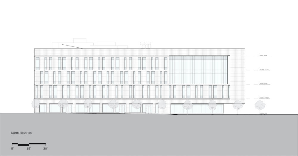 For the rainscreen, Perkins Eastman turned to TAKTL, a design and manufacturing operation located in the Greater Pittsburgh Region, to produce rectangular high-performance concrete panels. To blend in with the prevailing use of stone ashlar and brick for historic buildings in downtown Camden, the concrete panels are colored reddish-brown and finished to resemble non-glazed terra-cotta. The panels, measuring one-by-three feet, are face-fastened with color-matched screws to the light-gauge structural steel stud framing.
