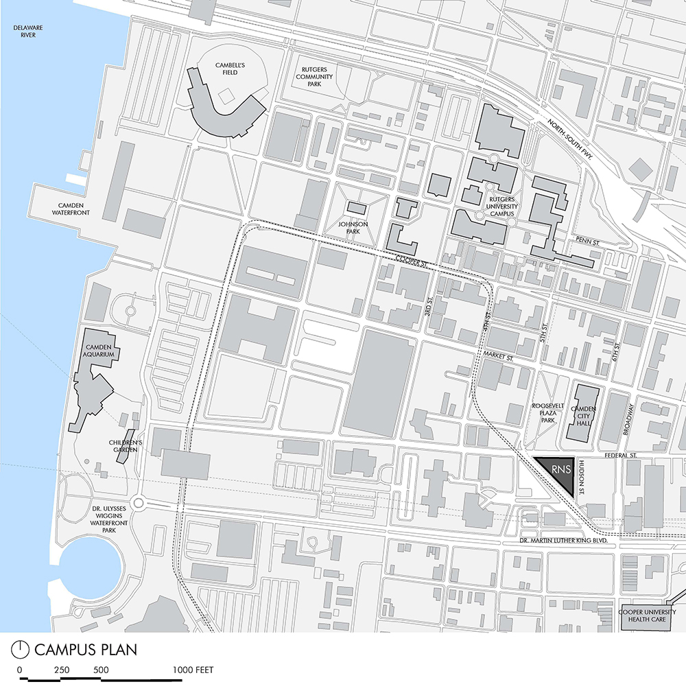 Completed in November 2017, the Perkins Eastman–designed School of Nursing and Science Building occupies a former parking lot in downtown Camden, establishing a new institutional heart for Rutgers University in the slowly reviving city. The design inhabits a formidable full-block mass, reaching a height of four stories with a multidimensional facade of high-performance concrete and glass curtainwall shaded by perforated panels.