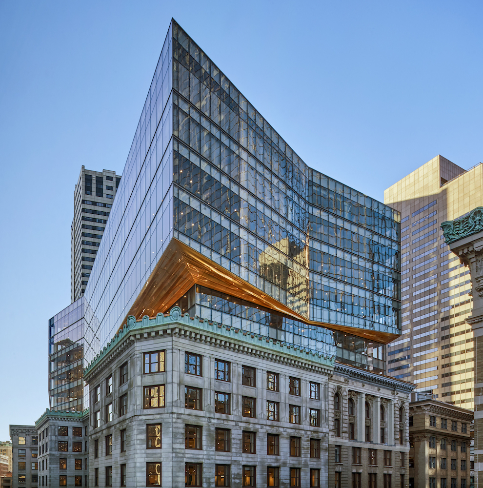 The structure’s sharply-angled cantilever and soffit are located on the prominent southwestern corner of the project, adjacent to Post Office Square. Arrowstreet collaborated closely with the FRP and the curtainwall manufacturers, Kreysler and Associates and Midwest Curtainwalls, to develop the soffit design. The design and fabrication teams reviewed three color options in both glossy and matte finishes, constructing full-scale mockups to effectively gauge the product most complementary with the historic ornamental metalwork found throughout the buildings. Ultimately, the team settled on an iridescent gold-like finish that reflects light to the street below.