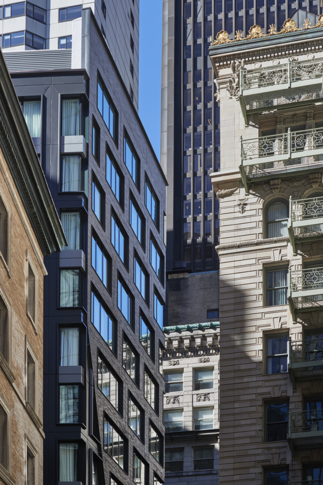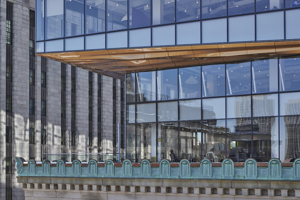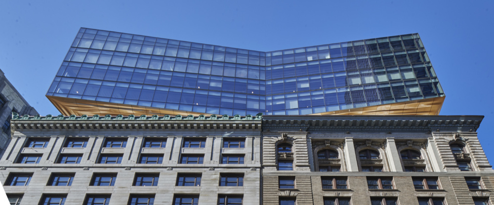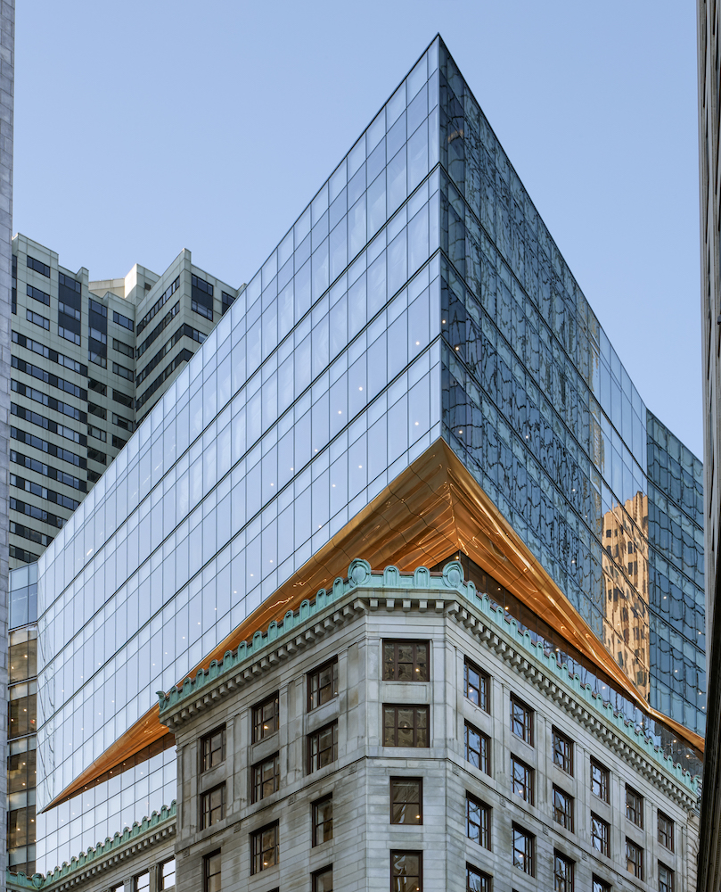 While the bulk of the project focused on the insertion of the seven-story glass pavilion atop three historic banks, the northern rump of the mixed-use project involved the restoration of two additional historic structures and the construction of an entirely new 12-story addition. The facade of the addition was manufactured by Island Exterior Fabricators and was fully installed in under two weeks.