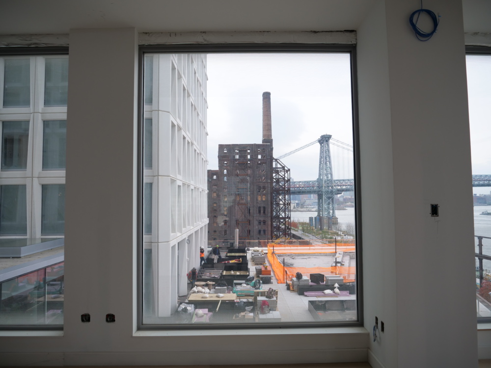 After an acid wash and polish, the panels were outfitted with their window systems and glazing. Then came the journey hundreds of miles north to Williamsburg, where the panels were craned into position and fastened to the floor slab with a series of steel anchors connected to six steel embeds cast into the concrete panels.
